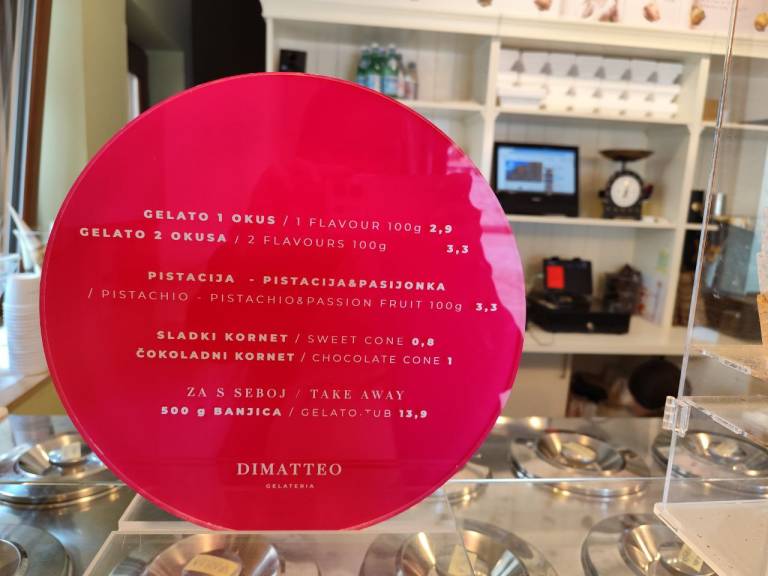 Kepica z enim okusom stane 2,90 evra, z dvema okusoma pa 3,30 evra – toliko stane tudi 100 gramov sladoleda pistacije ali pistacije s pasijonko. Pistacija je tudi pri njih seveda najbolj prodajan okus.