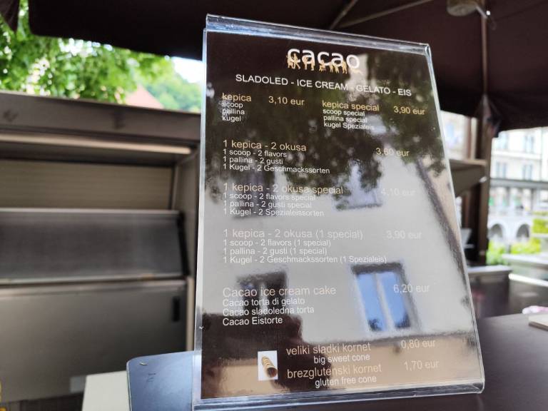 Če v eni kepici vzamete dva okusa, stane kepica 3,60 evra, ena kepica z dvema special okusoma pa 4,10 evra.