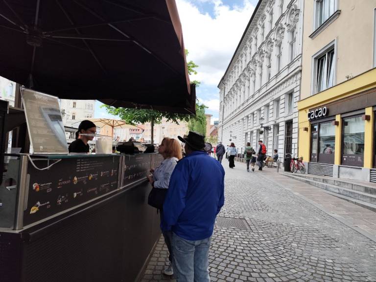 Na promenadi ob Ljubljanici se ustavimo še v Loliti, kjer stane kepica sladoleda 2,60 evra, ponudba pa je še skromna.