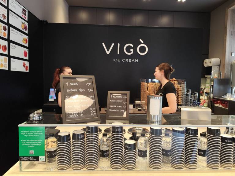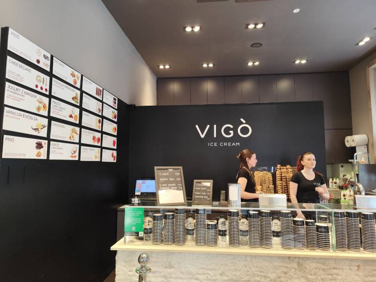 V bližini je slaščičarna Vigo, kjer imajo letos kar precej novih okusov, stane kepica 2,90 evra, kepica z mešanim okusom oziroma iz dveh okusov pa 3,90 evra. Tudi pri njih gostje najraje ližejo okus pistacija primavera.