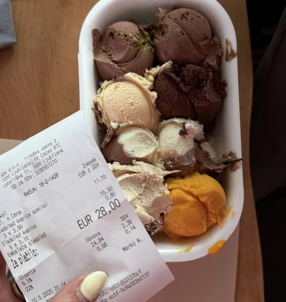 V lokalu Cacao na Petkovškovem nabrežju je družina namreč za osem kepic sladoleda plačala 28 evrov.