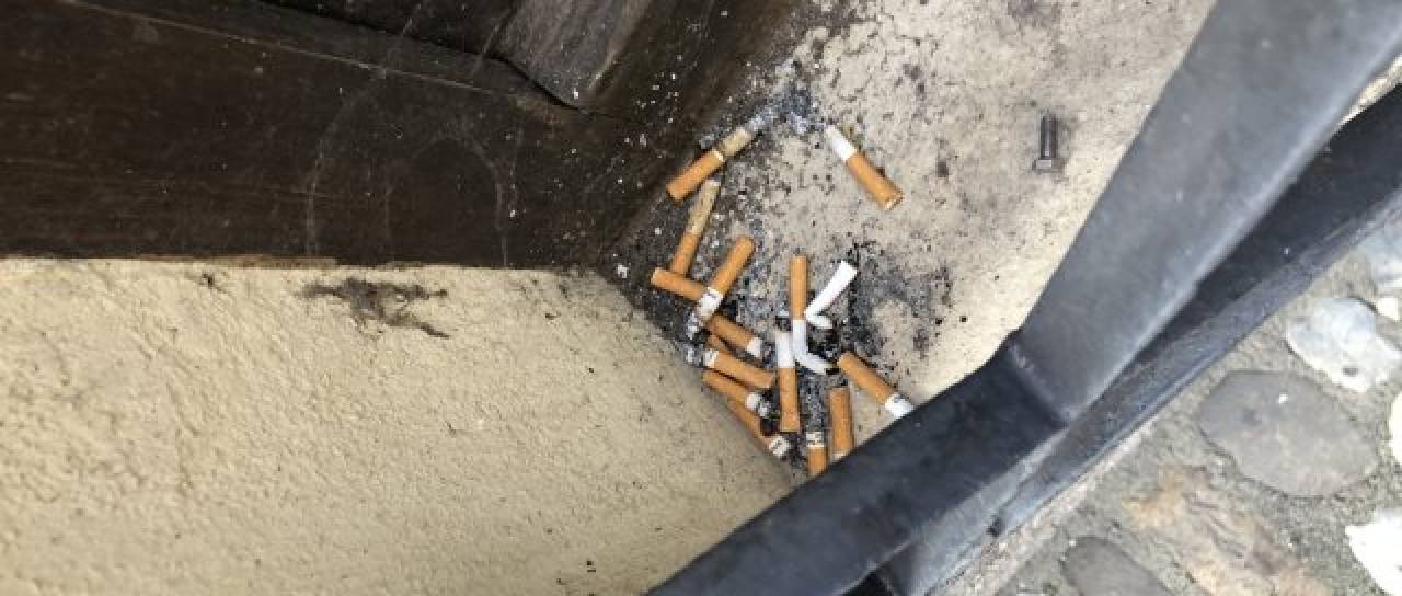 Cigaretni ogorki na okenski polici na ljubljanskem Ribjem trgu. Šlo naj bi za početje natakarjev tamkajšnjega lokala, ki naj bi cigaretne ogorke metali tudi v jašek za vodo in pod vrata antikvarjata.