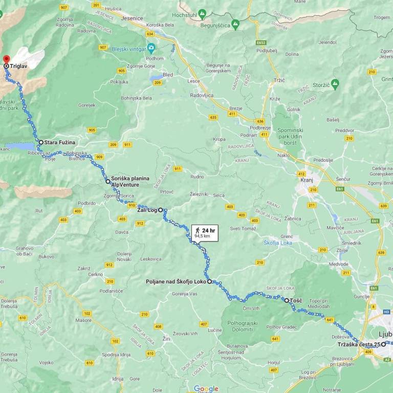 Njegova je potekala približno takole: Fakulteta za elektrotehniko, Ljubljanski grad, Tošč, Poljane nad Škofjo Loko, Črni kal, Zali Log, Soriška planina, Stara Fužina, Triglav.