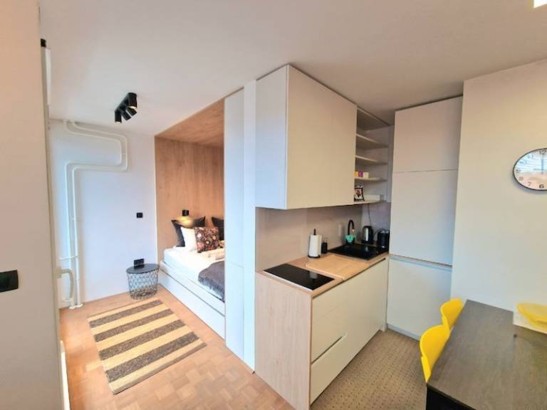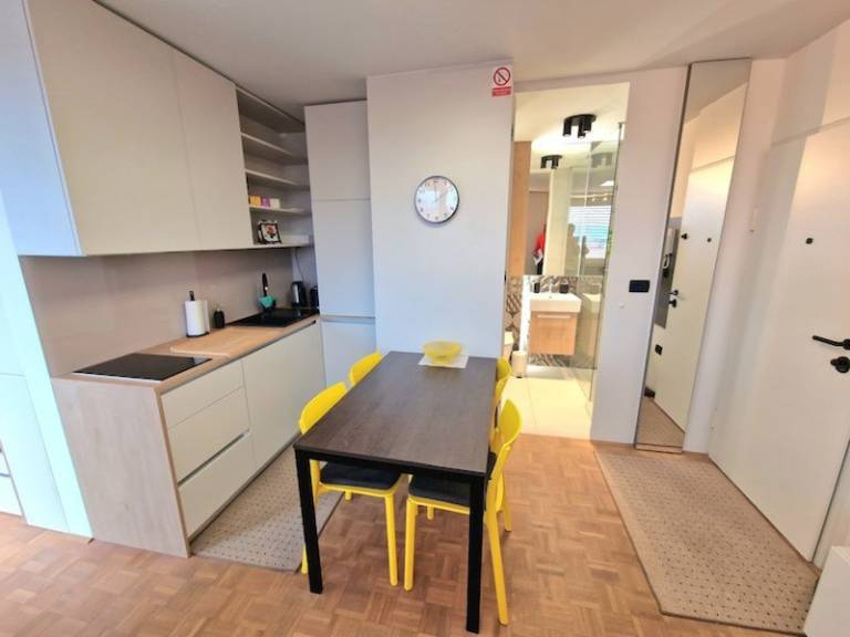 Garsonjera je opremljena s pohištvom po meri; v njej so hladilnik, pomivalni in pralno-sušilni stroj.
