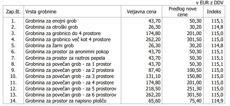 Višja je tudi cena grobnine za otroški grob, ki zdaj znaša 30,2 evra namesto 26,30 evra. Prostor za raztros pepela in prostor za anonimni pokop prav tako stane 50,3 evra, za prostor z napisno ploščo pa je cena 75,4 evra.