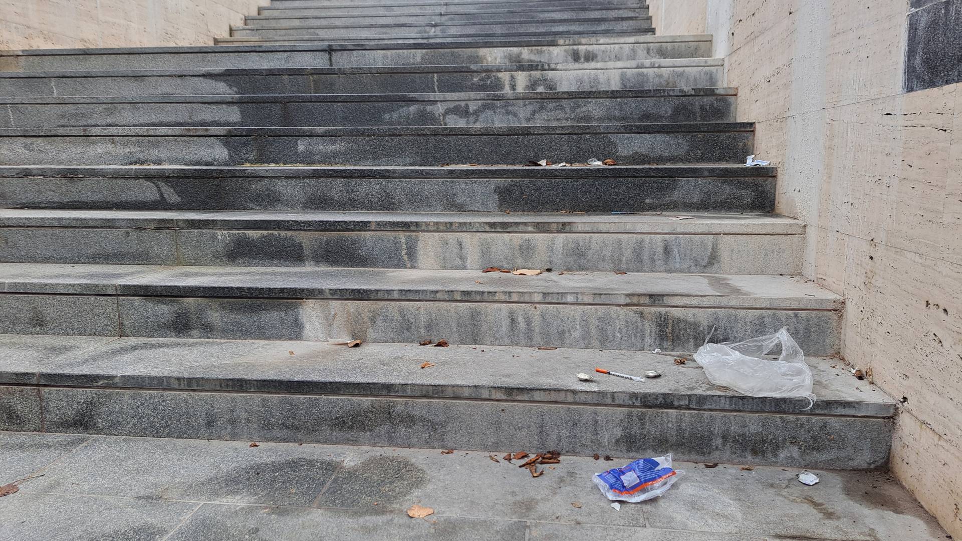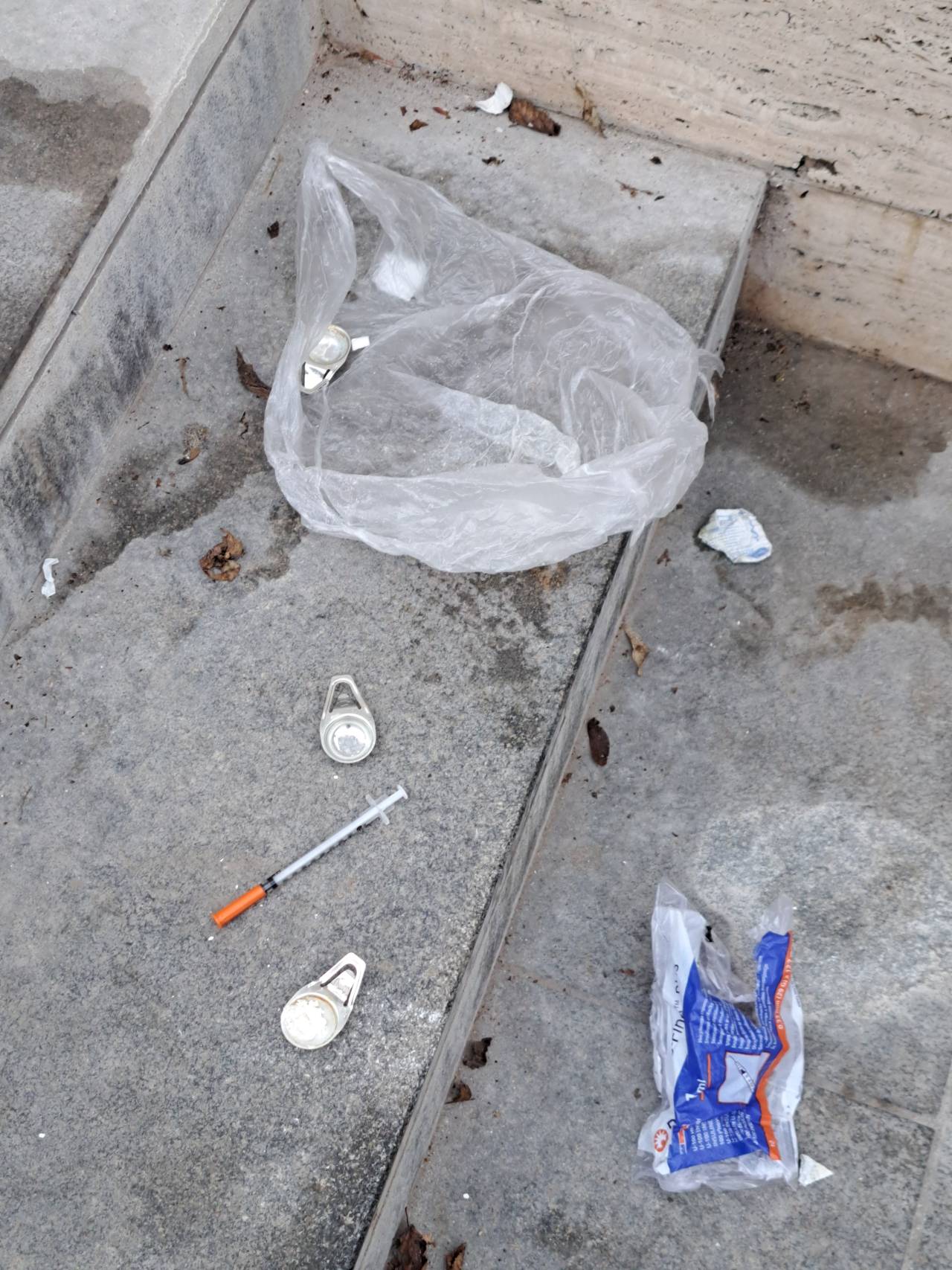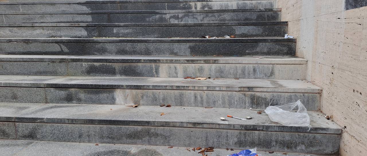 Skratka, na stopnici je med smetmi ležala igla, ob njej še trije predmeti s pripravkom v obliki praška.
