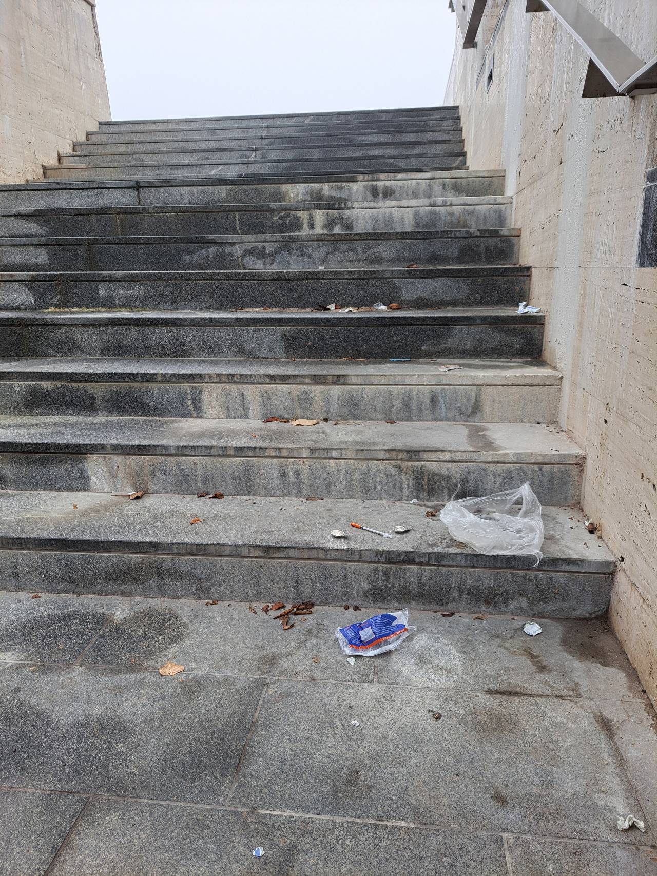 Fotografije so nastale danes dopoldne na stopnišču, ki vodi v ter iz podhoda Bežigrajska vrata. Da gre dnevno skozenj precejšnje število ljudi, verjetno ni treba posebej poudarjati.