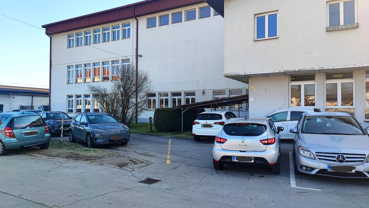 Na severnem delu stavbe pa sta bili na rumeni talni označba v obliki X, ki označuje območje, kjer je ustavljanje ali parkiranje prepovedano, delno parkirani dve vozili.