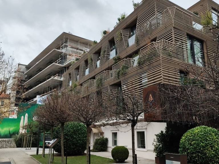 »Pomemben člen arhitekturne zasnove je tudi fasada v kamnu v zelenem odtenku in velikimi cvetličnimi koriti iz katerih bo kipelo zelenje, ki nagovarja naravno rastlinsko okolico, ter jo z svojimi velikimi steklenimi površinamo tudi reflektira.