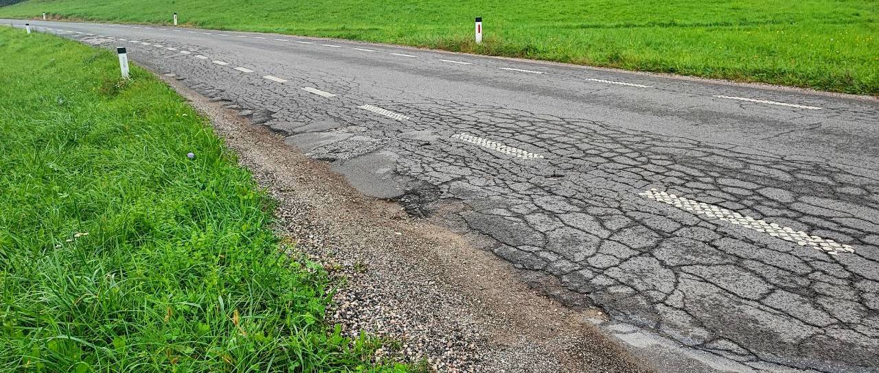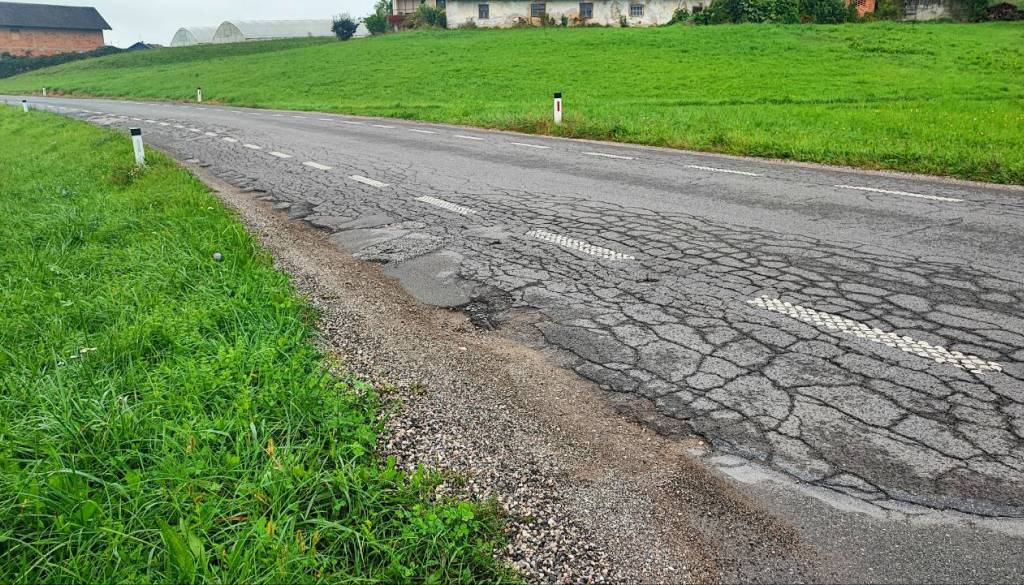 Gre za odsek, kjer asfalt razpada, vidne so razpoke, luknje in vdrtine, ob robovih vozišča pa se nabira pesek.