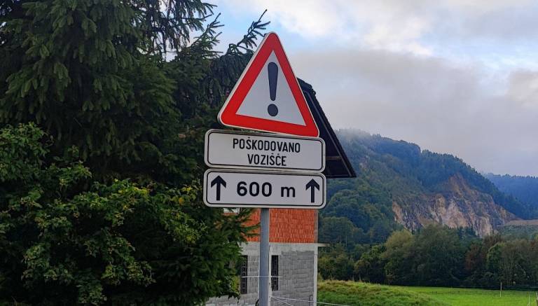 Za zdaj je občina ukrepala samo tako, da je postavila prometni znak, ki naznanja poškodovano vozišče ...