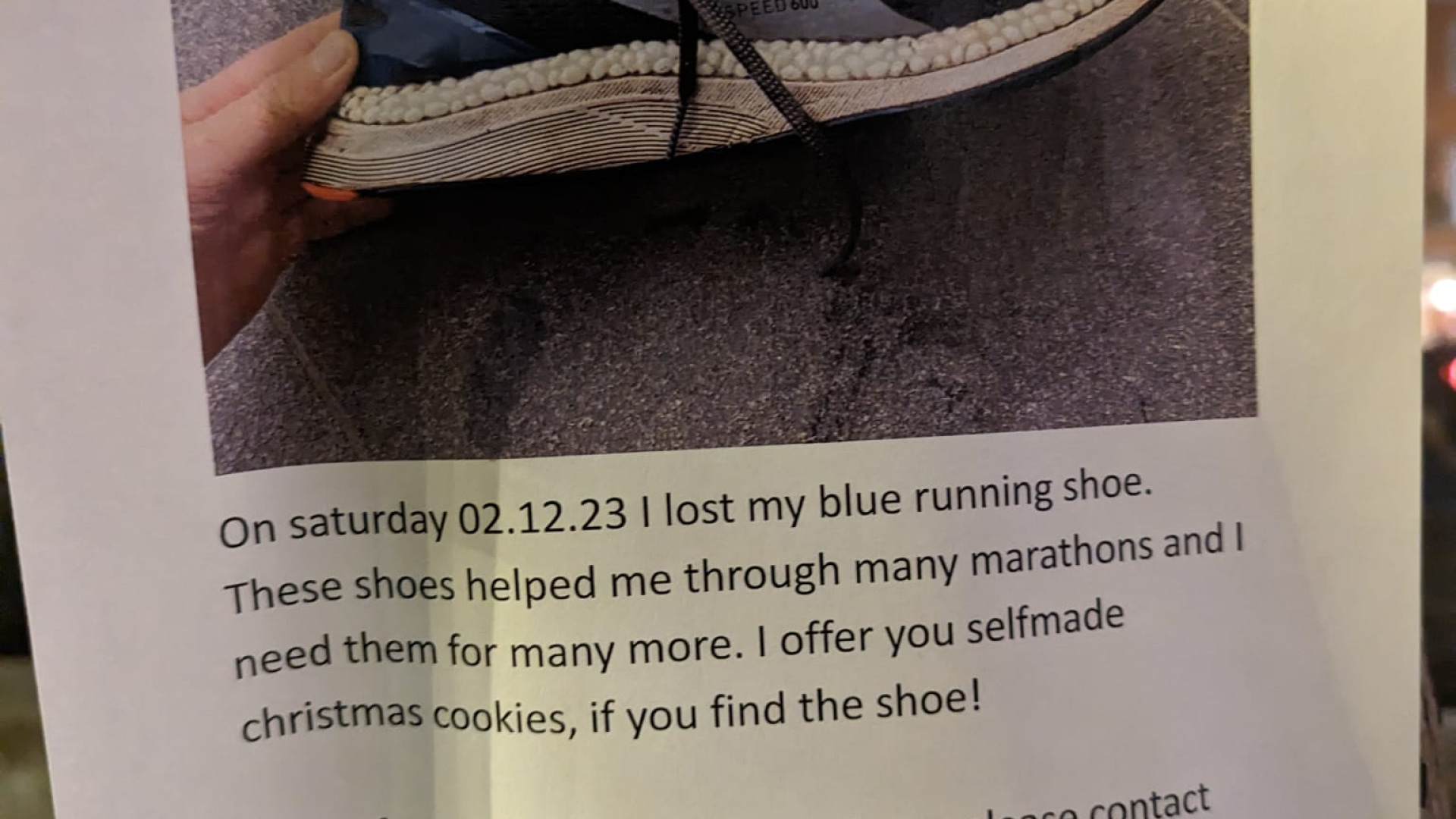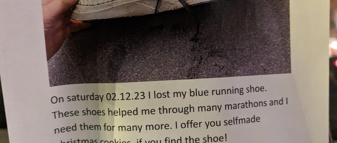 Če strnemo: kos tekaške obutve modre barve, ki je lastniku oziroma lastnici služil na številnih maratonih, je izginil v soboto.