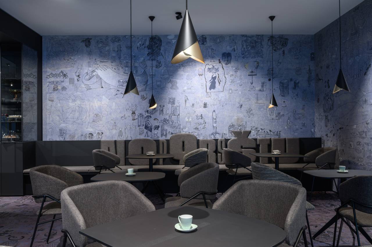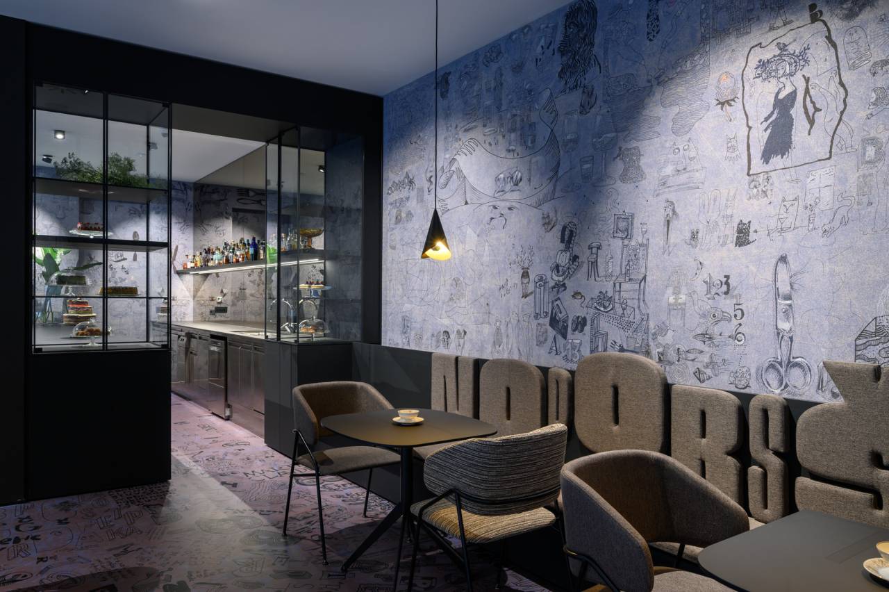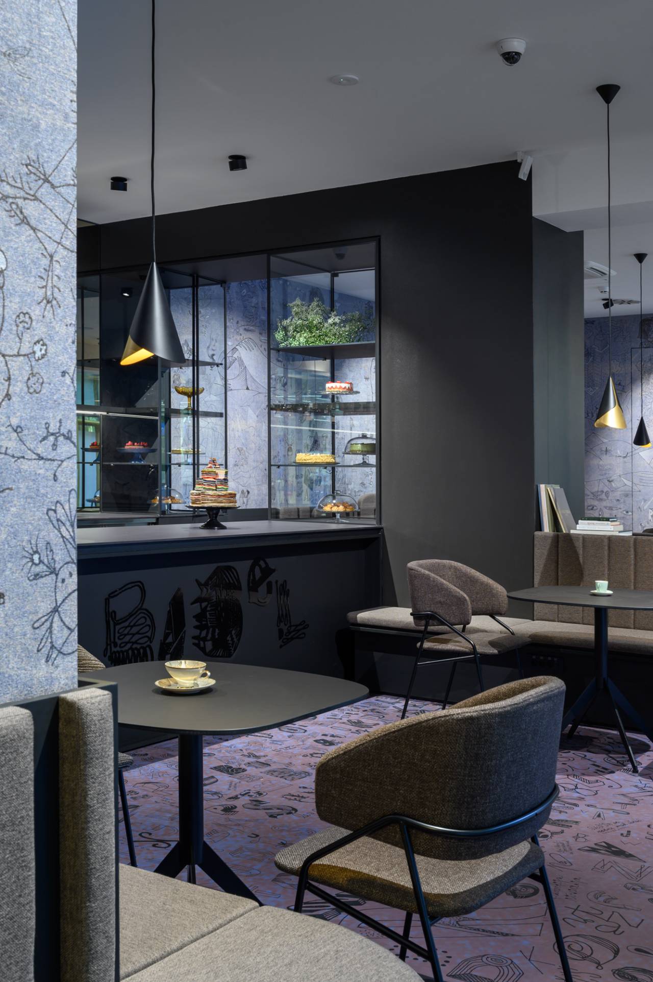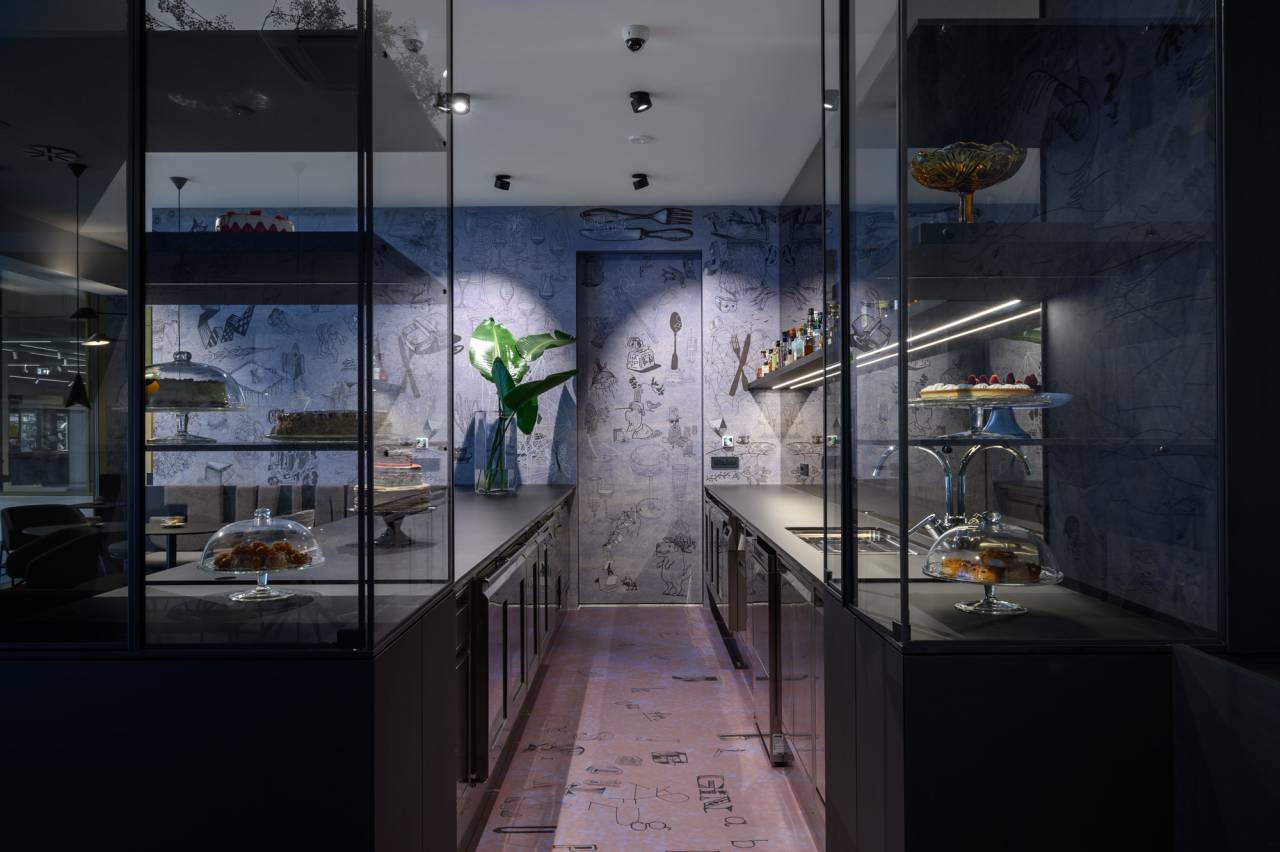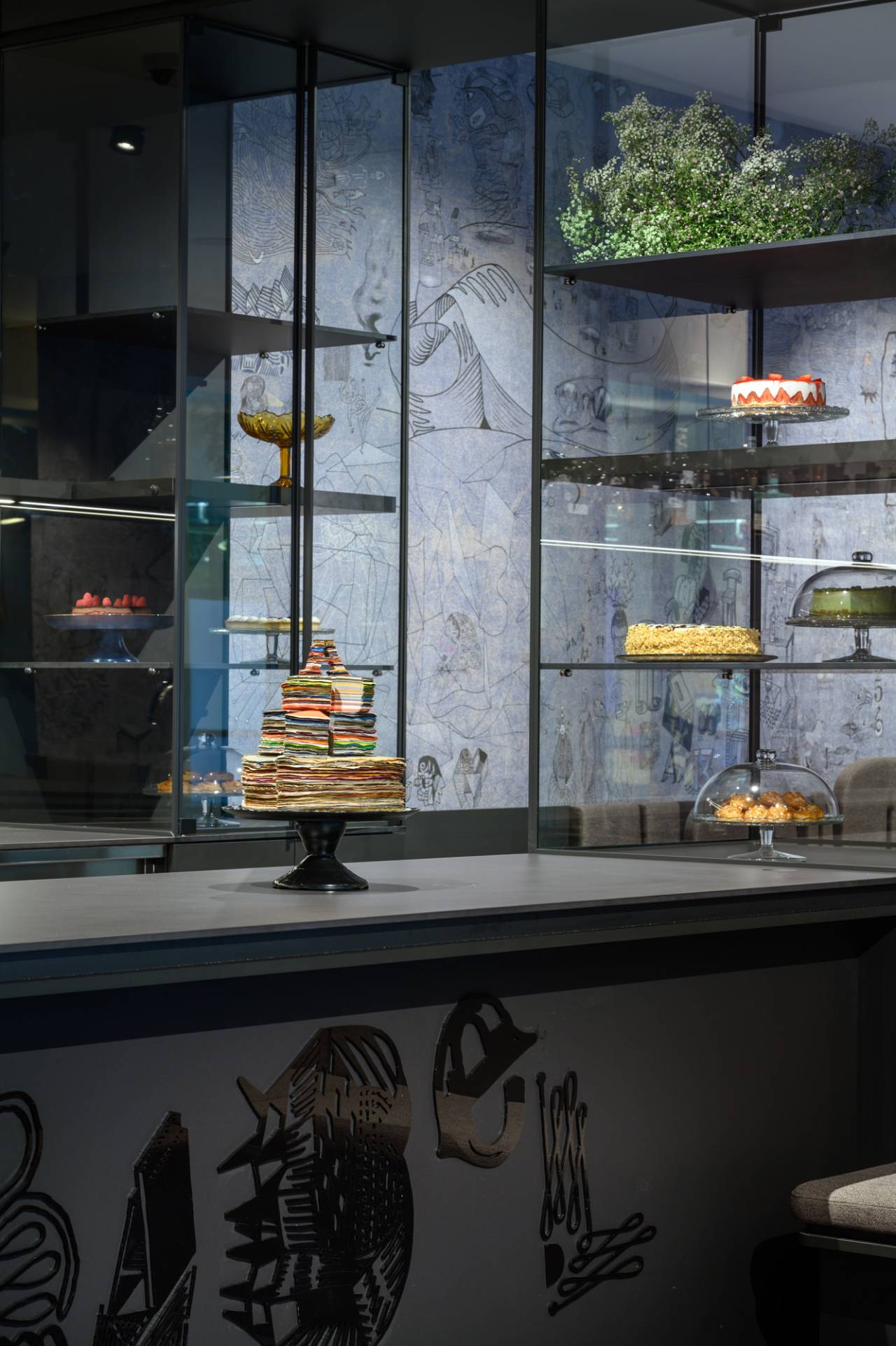 Na sredini prostora je steber, obdan s po meri izdelanimi vitrinami, ki se nadaljujejo v klopi. Dodatne klopi so razporejene vzdolž celotnega oboda kavarne; dodatna sedišča so na voljo v obliki stolov iz različnih materialov in tekstur.