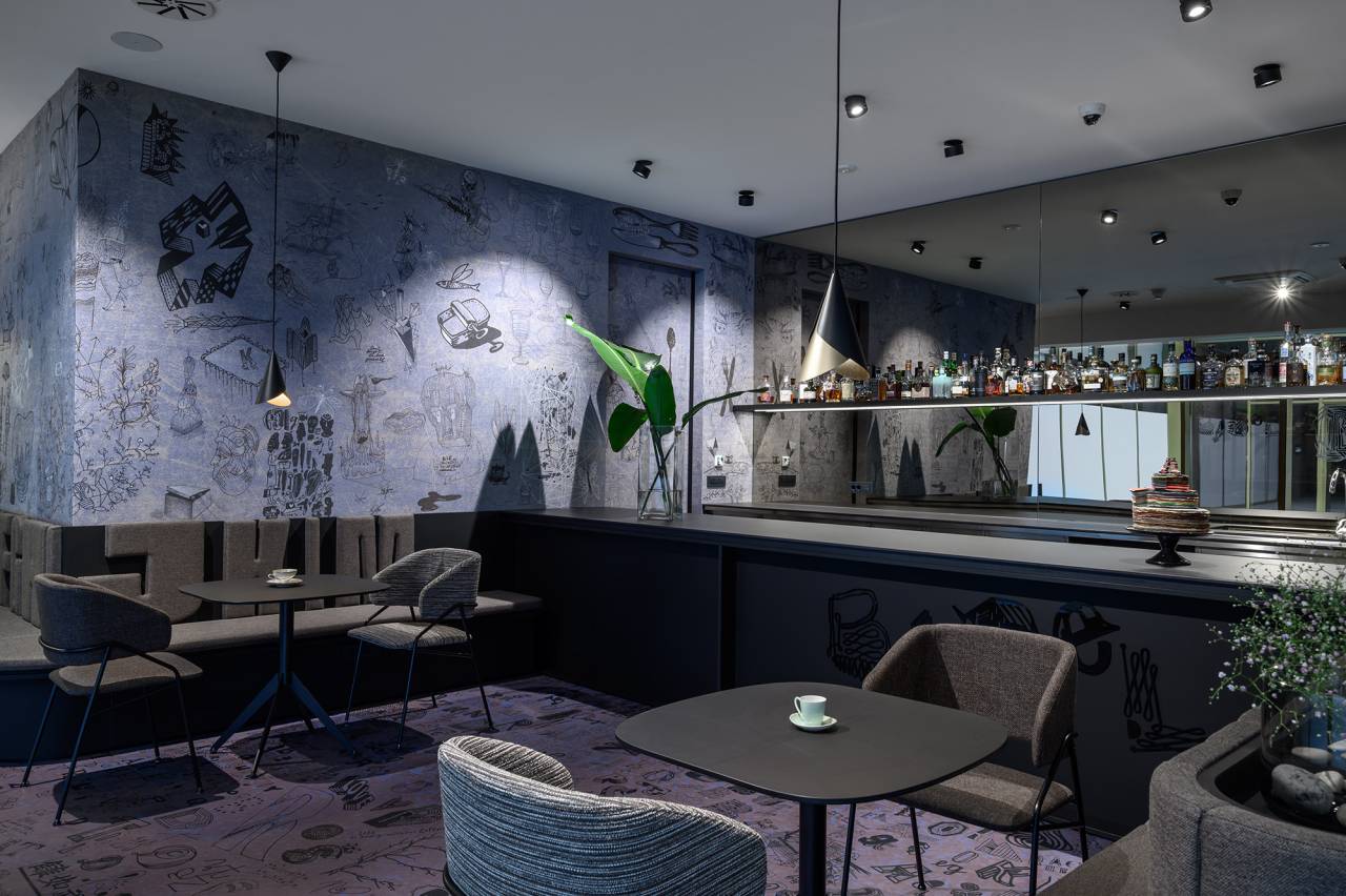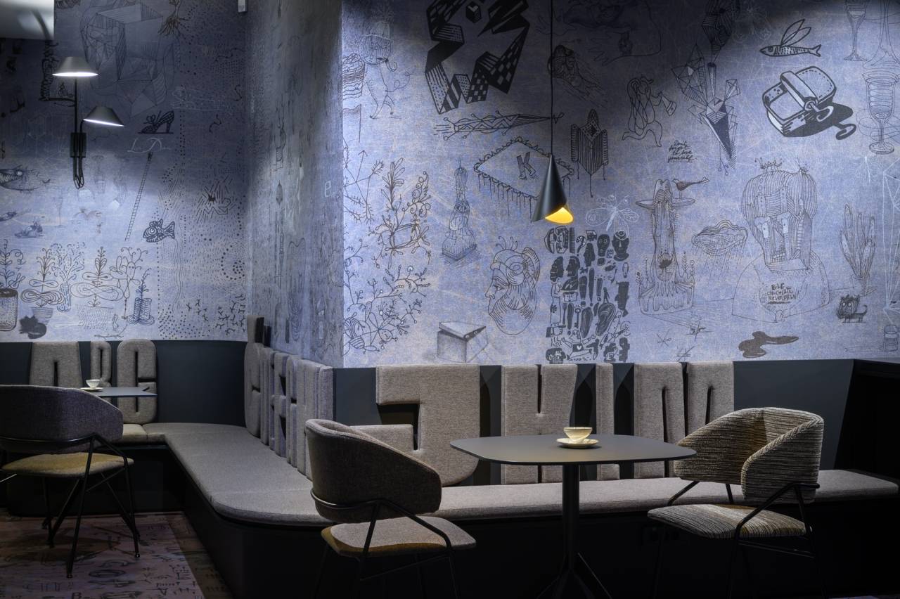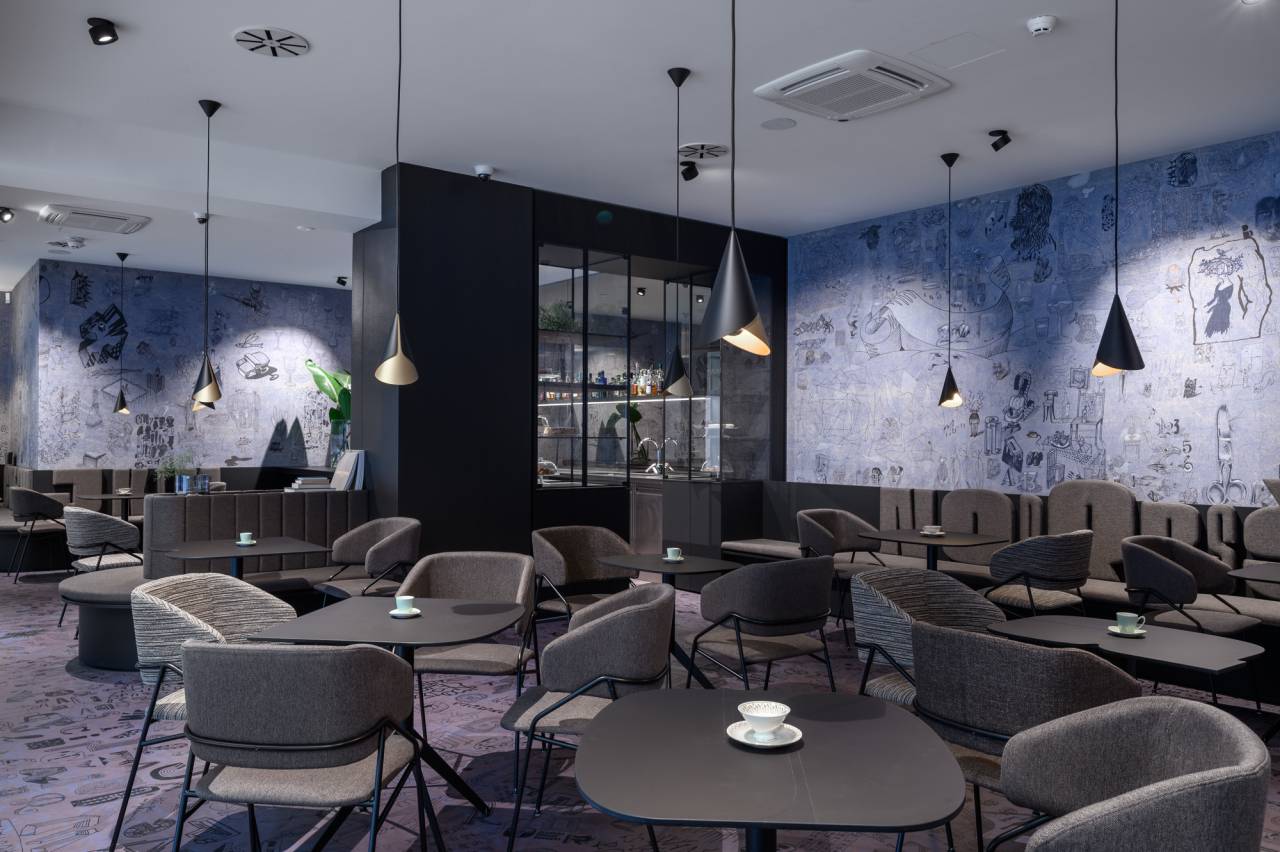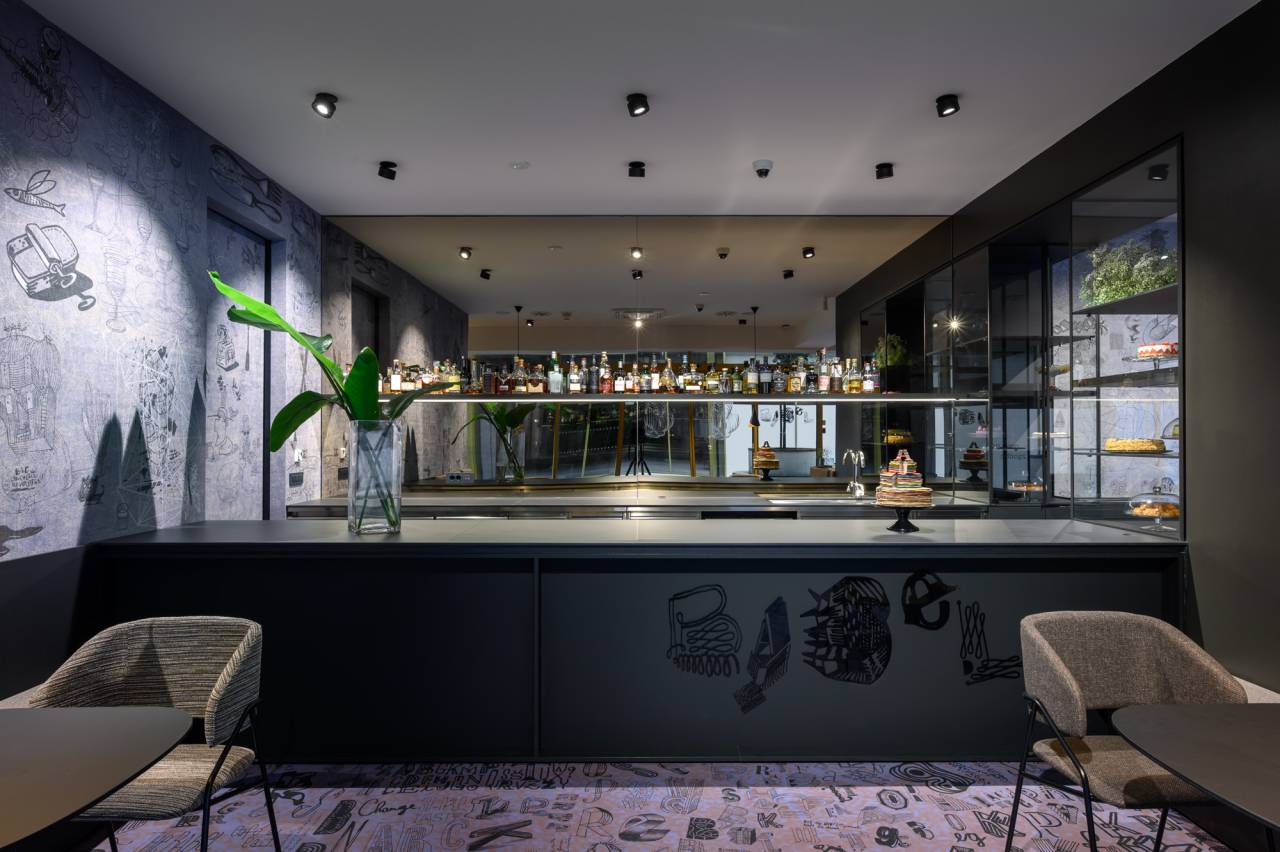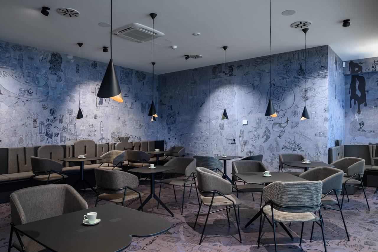 Na sredini prostora je steber, obdan s po meri izdelanimi vitrinami, ki se nadaljujejo v klopi. Dodatne klopi so razporejene vzdolž celotnega oboda kavarne; dodatna sedišča so na voljo v obliki stolov iz različnih materialov in tekstur.