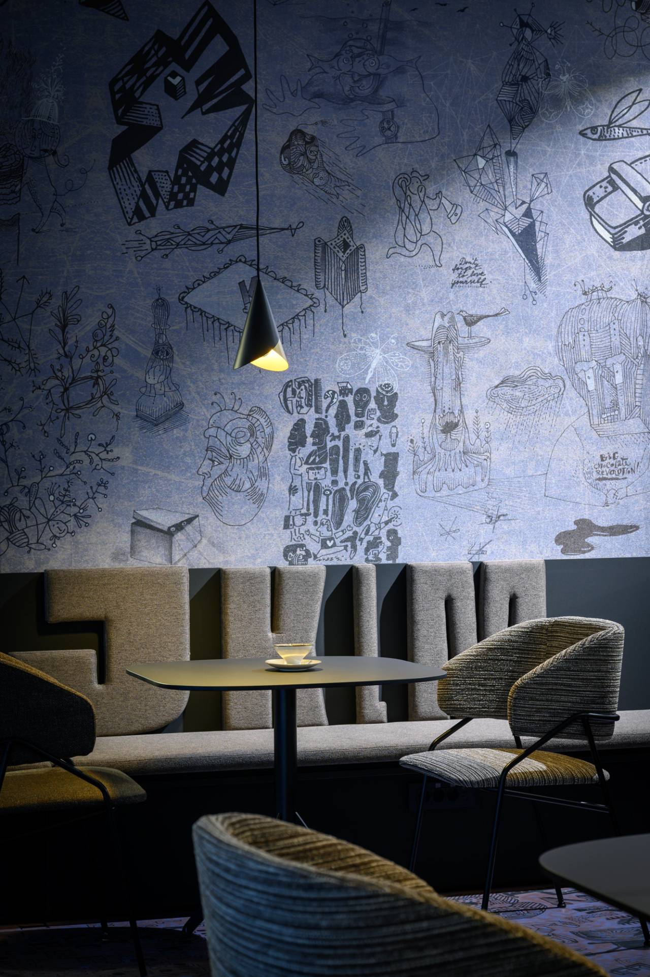 Ti materiali se ponovijo na hrbtiščih klopi, ki so oblikovana v obliki črk. Obliko črk posnemajo tudi izrezane mize.