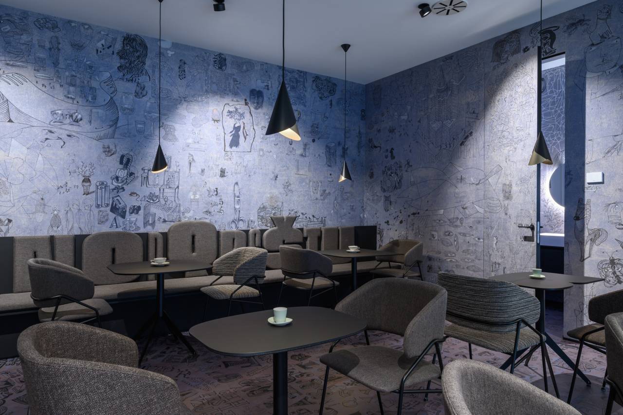 Na obeh straneh kavarne sta separeja s pogledom na dvorišče oziroma vrt kavarne. Razsvetljava pa poudarja tapete, ki jih je oblikoval Jenko. Te je moč najti na tleh in stenah; če kaj, potem so glavni poudarek dizajna, ki ga dopolnjujejo ostali elementi.