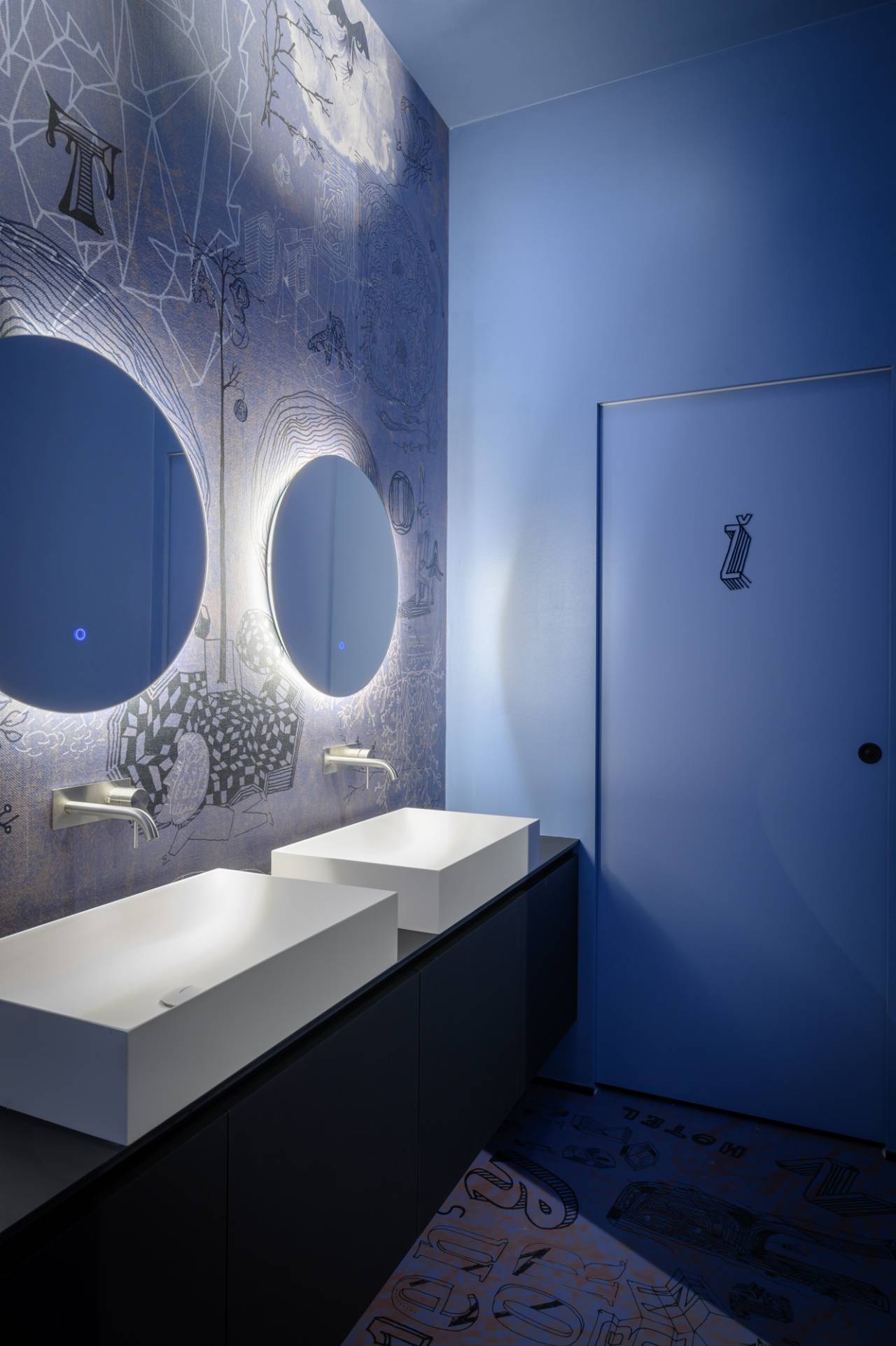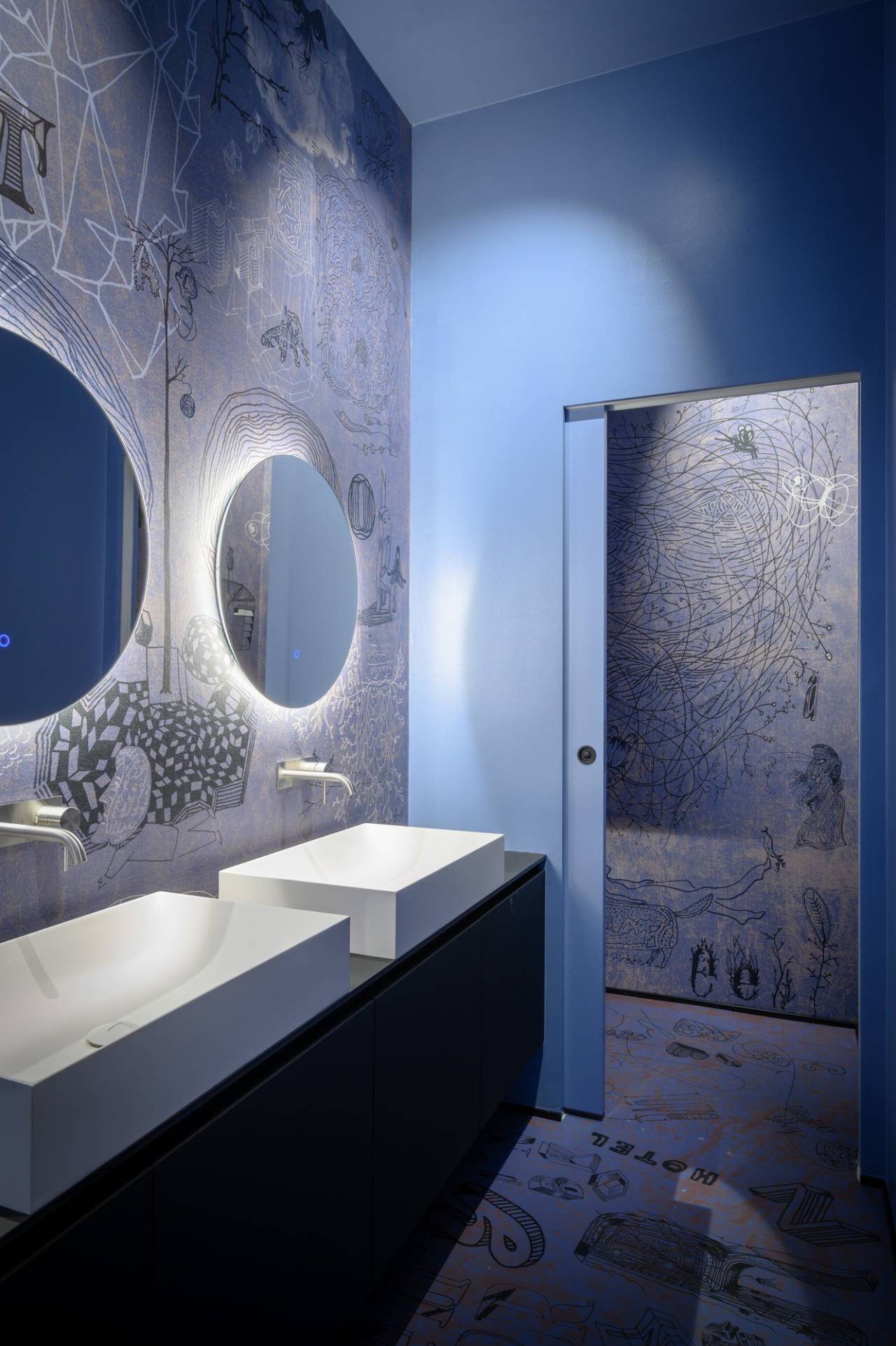 Za pultom iz črnega neolitha je hrbtišče iz toniranega ogledala; to odseva barvno shemo prostora - odtenke vijolične, rjave in sive.