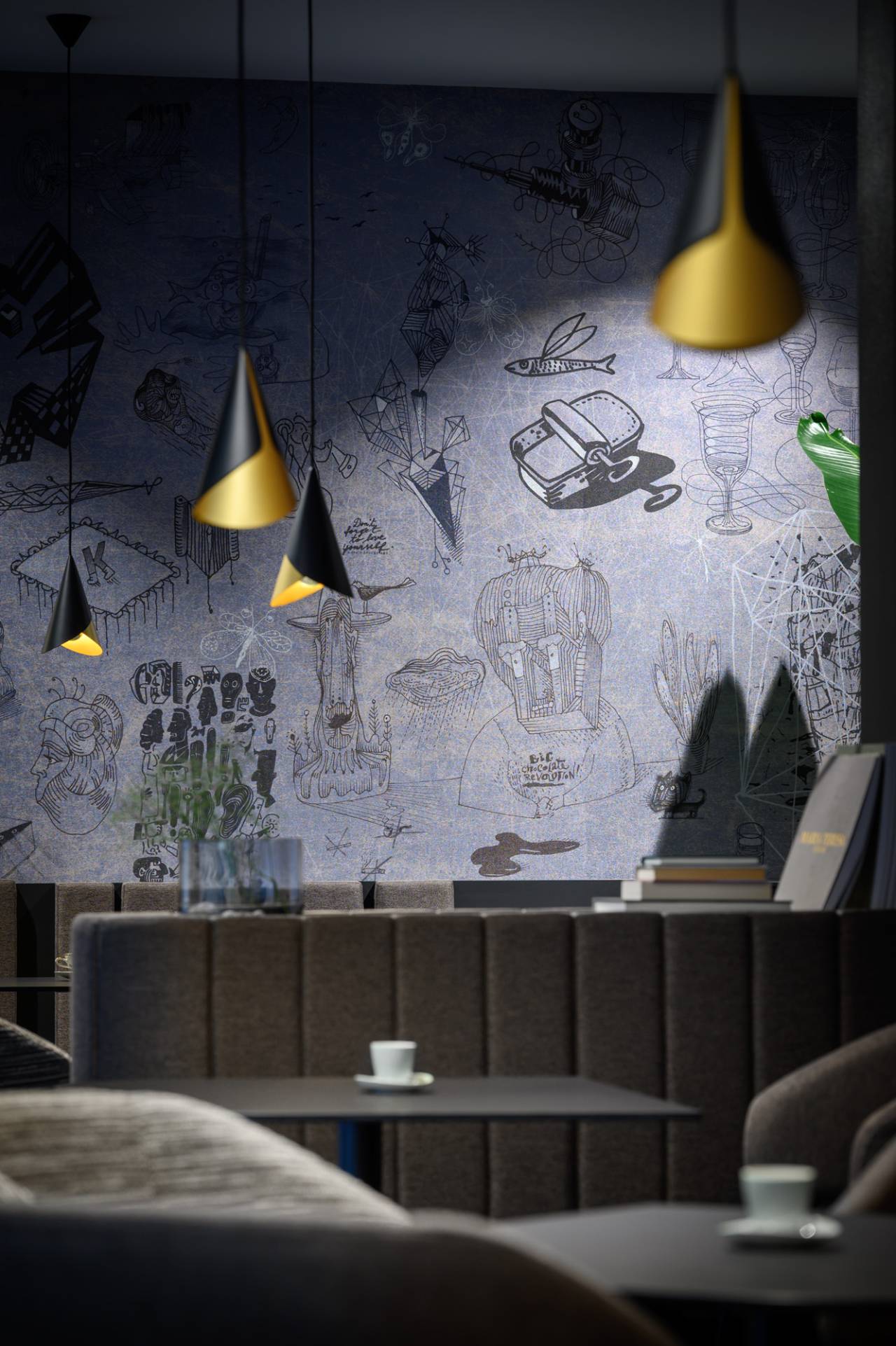 Tla kavarne tako prekriva 3205 različnih ročno izdelanih kaligrafskih črk, ki tvorijo 96 besednih zvez; tapeta, ki objema stene, meri skoraj 65 kvadrantih metrov. Na njej je 524 podob.