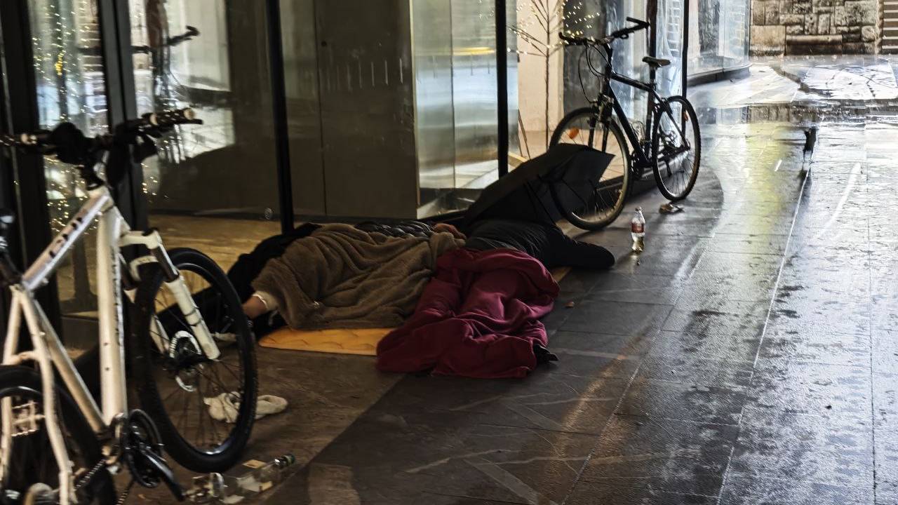 Naše oko pa je ujelo še en prizor - improvizirano posteljo, in sicer na tleh pred eno od izložb, kjer sta v času našega obiska spali dve osebi.