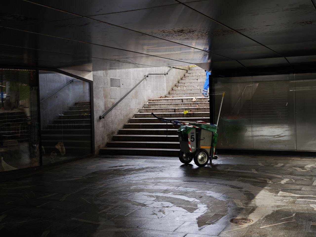 Ko smo ga danes obiskali mi, je bila na delu ekipa čistilcev, ki je pometala in mokro čistila tla, kar bo verjetno odstranilo vonj po urinu in bruhanju ter opravilo z drugo nesnago.