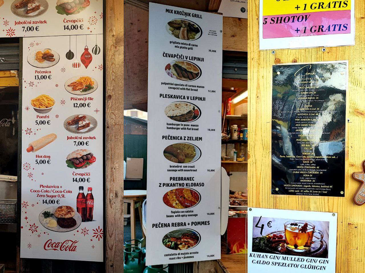 Pečenica s kislim zeljem vas bo stala 13 evrov, čevapčiči v lepinji 14 evrov, hamburger prav tako 14 evrov, piščančji file s krompirjem 12 evrov, kranjska klobasa z zeljem 12 evrov, golaž pa kar 14 evrov.