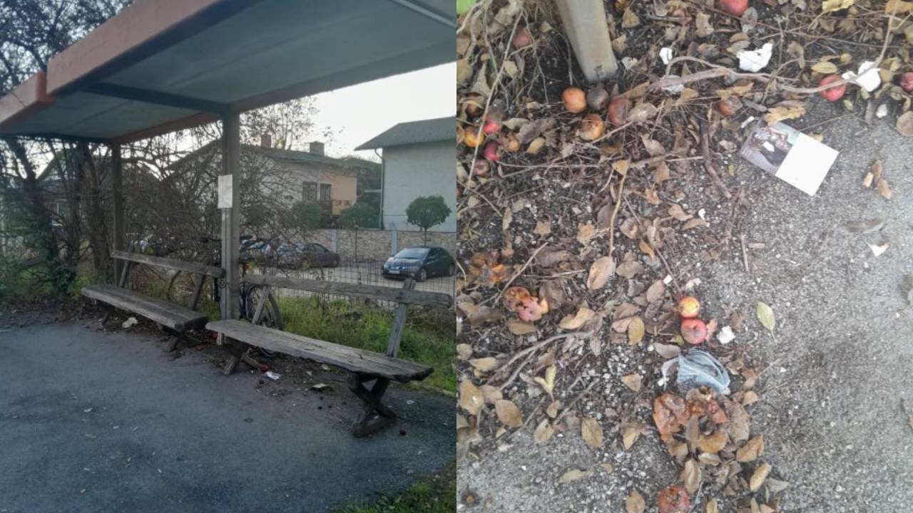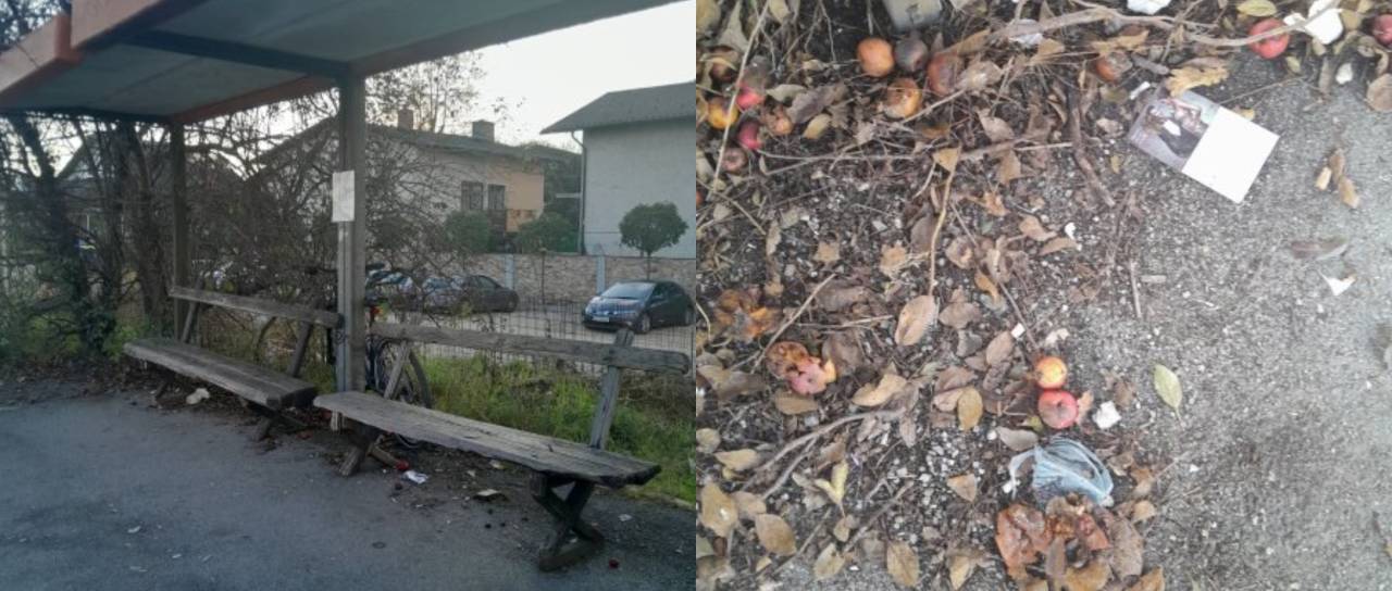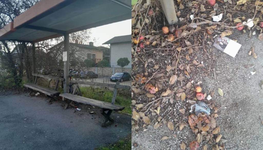 »Sramota, poglejte to avtobusno postajo, na kateri ustavlja ogromno avtobusov in jo uporablja ogromno ljudi. Popraviti je potrebno nadstrešek, porezati trnje in veje, pomesti po tleh, postaviti koš za smeti, zamenjati klopi (ki so jih postavili krajani) ...
