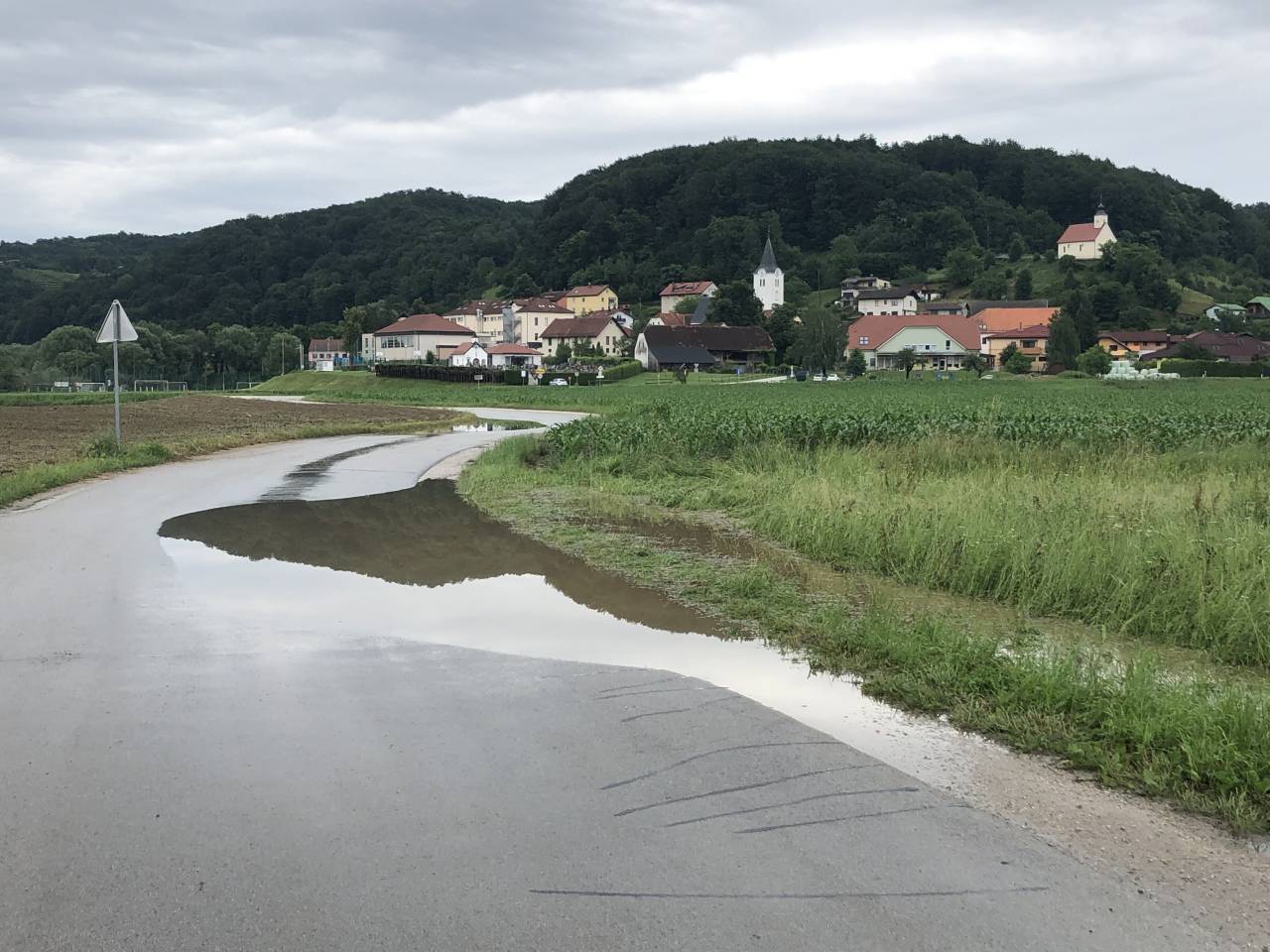 Meteorne vode so včeraj zalivale hiše, ceste, polja in travnike, v Spodnji Novi vasi, v občini Slovenska Bistrica, pa je voda zalila tudi piščančjo farmo.