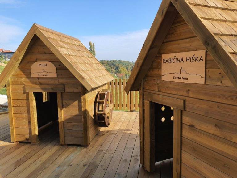Hiške v miniaturni vasici, ki je postavljena v neposredni bližini Osnovne šole Sveta Ana, so postavljene v takšnem merilu, da lahko vanje splezajo le otroci.