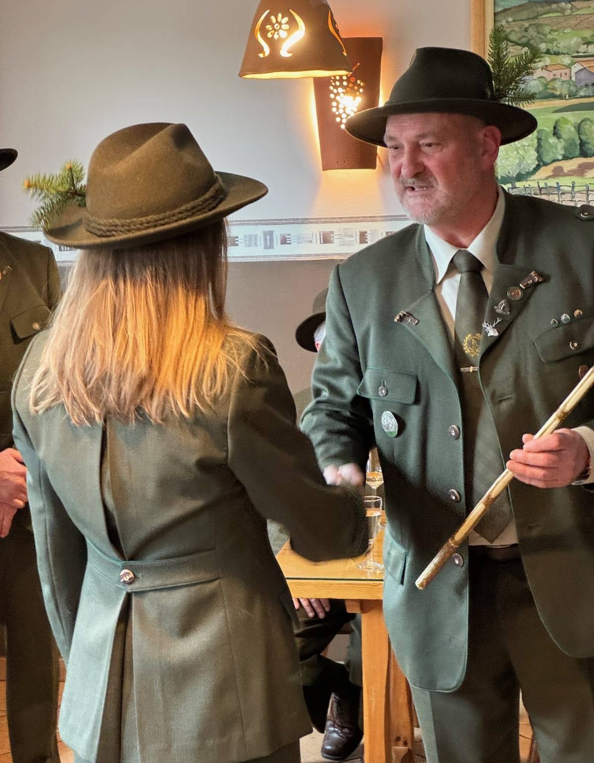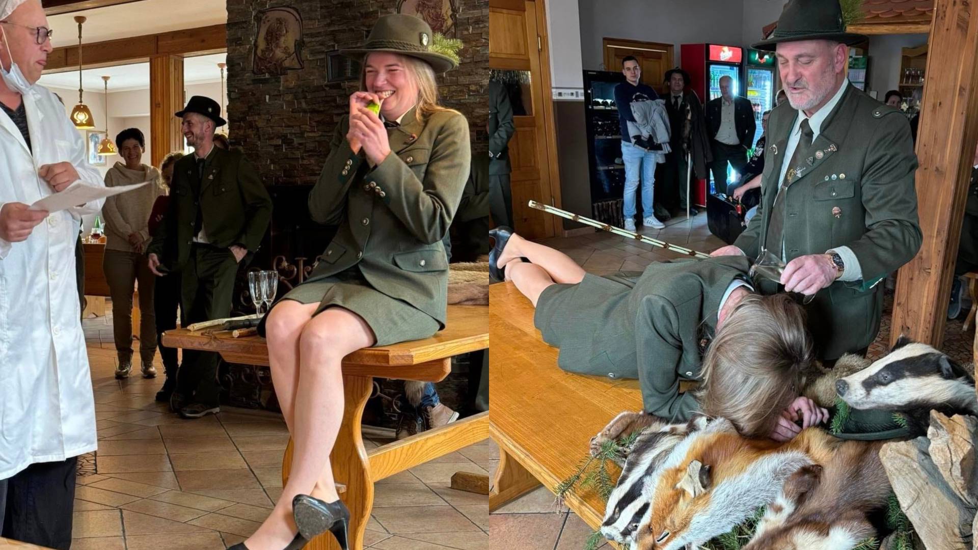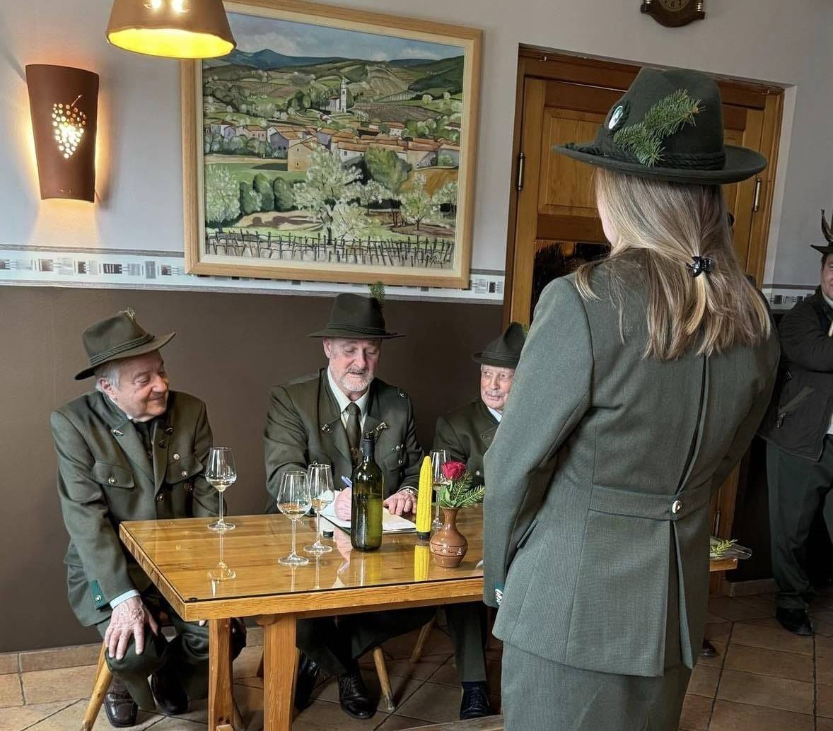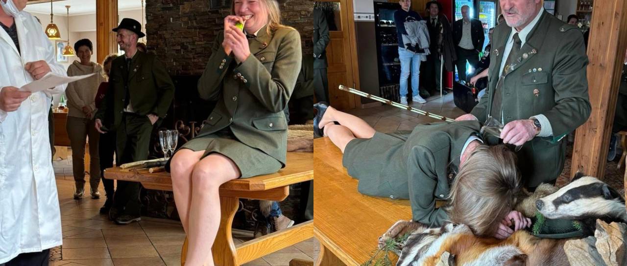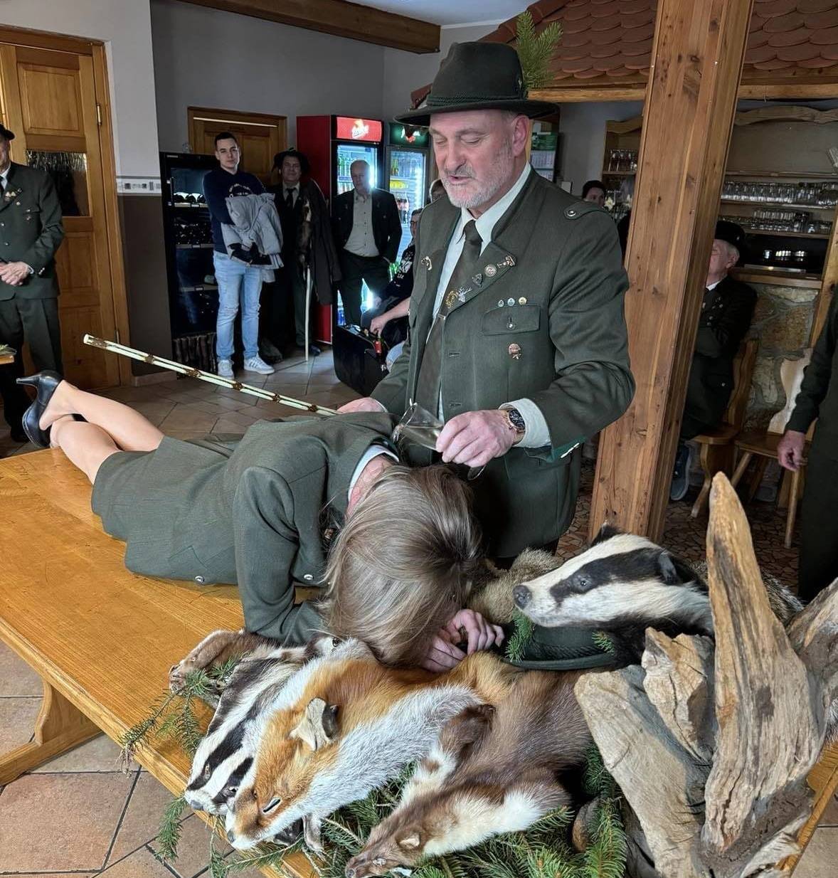 Na zatožno klop v dvorani vinogradniške kmetije Skupek so posadili mlado lovko Tadejo Toplak, ki je lani opravila lovski izpit.