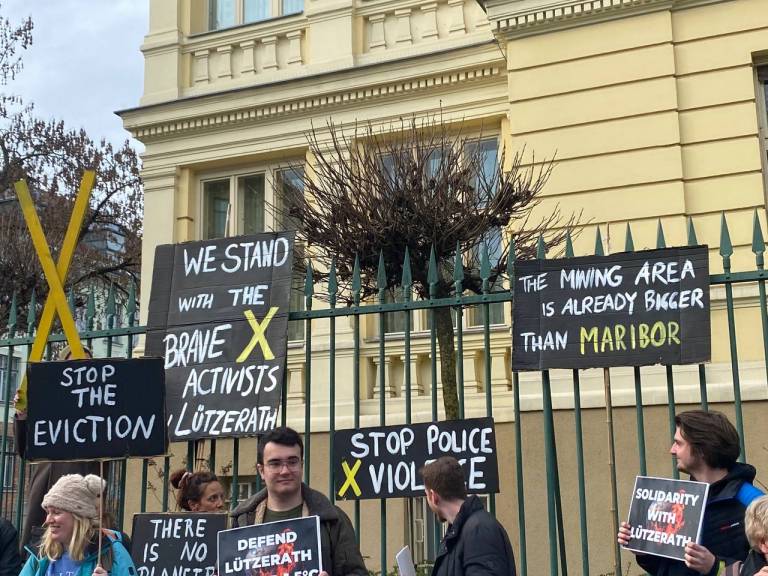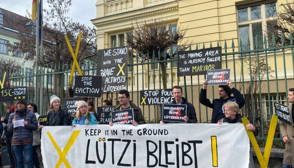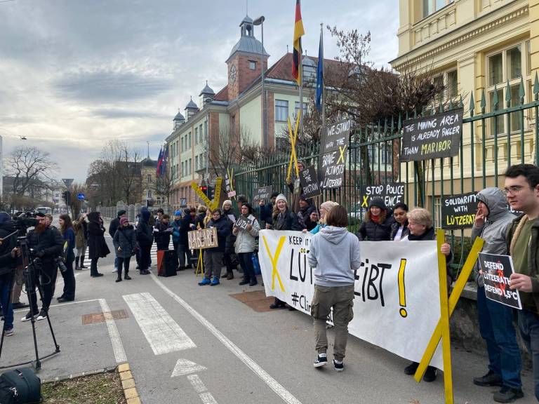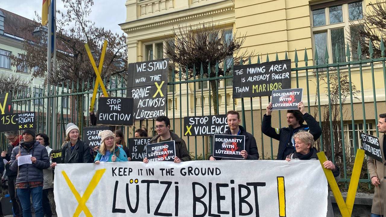 Mladi za podnebno pravičnost so danes pred nemškim veleposlaništvom organizirali protest v podporo aktivistom v nemškem Lüzerathu, ki se zavzemajo za zaščito vasi in prenehanje izkopavanja premoga.