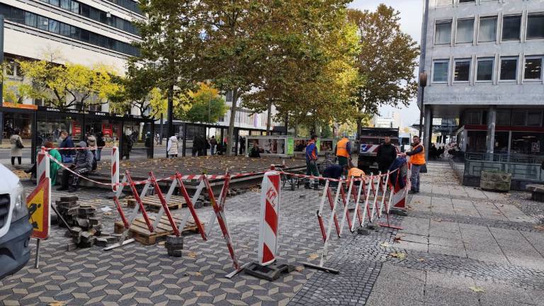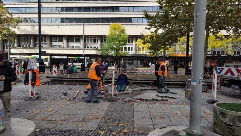 Na Bavarskem dvoru v Ljubljani poteka obnova tlakovcev, ki so se sčasoma posedli zaradi težkih vozil, ki se vozijo po ploščadi.