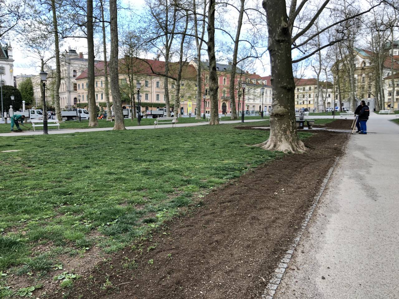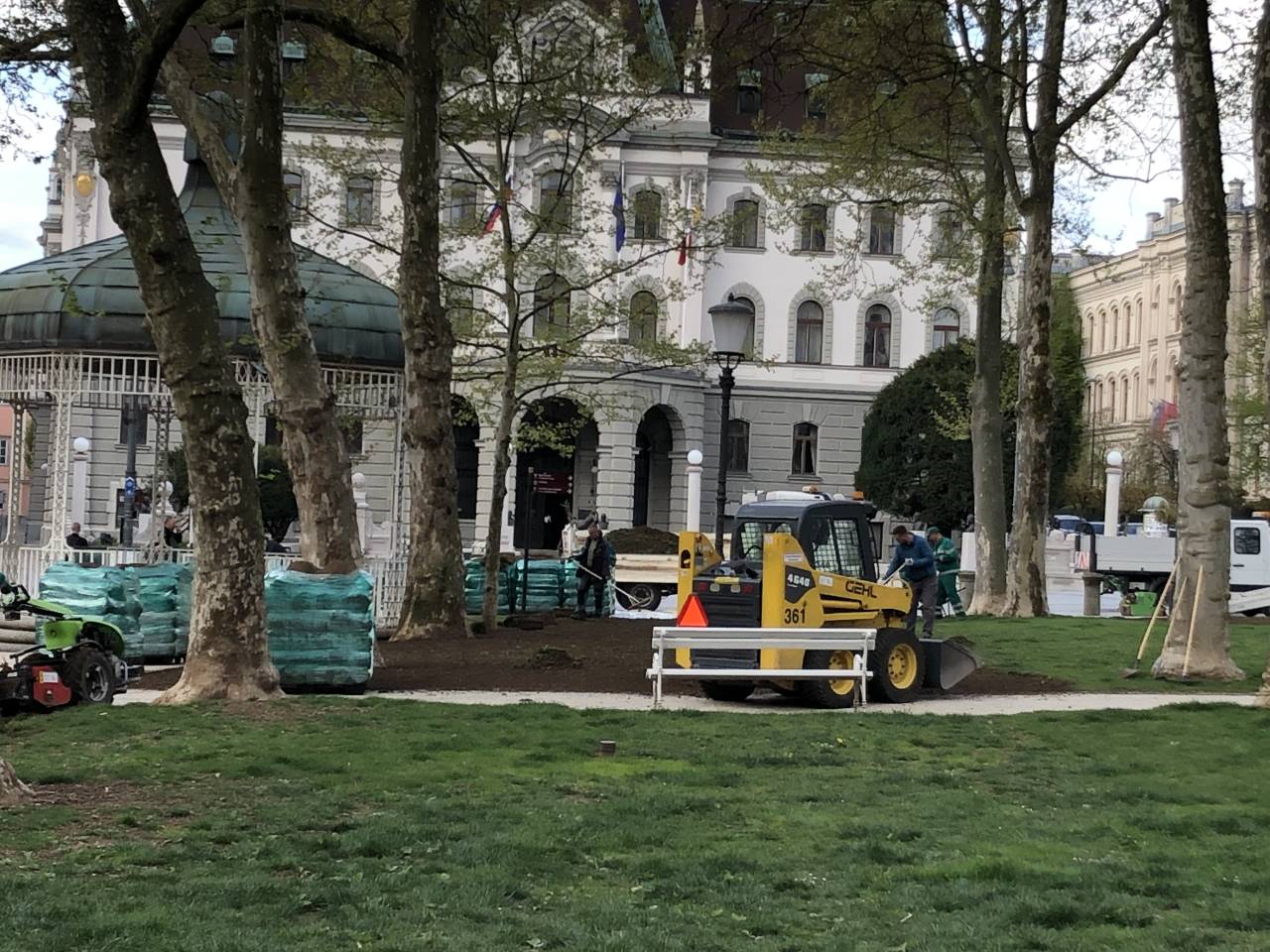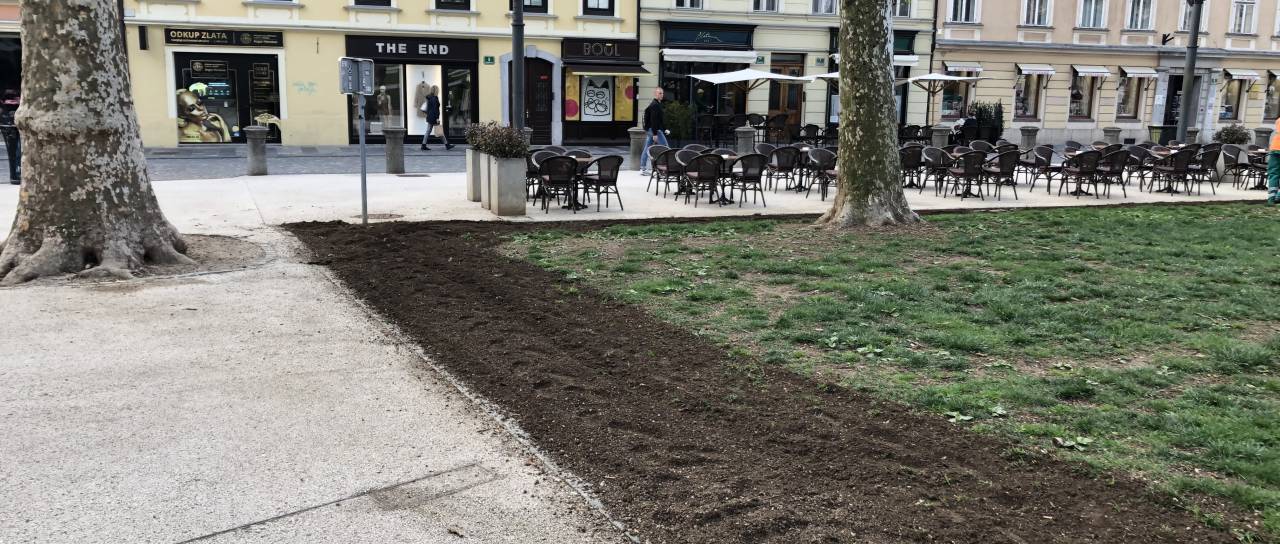 V dopoldanskih urah je bilo na Kongresnem trgu moč opaziti več delavcev in strojev. Na nekaterih delih ob poteh je travo nadomestila zemlja.