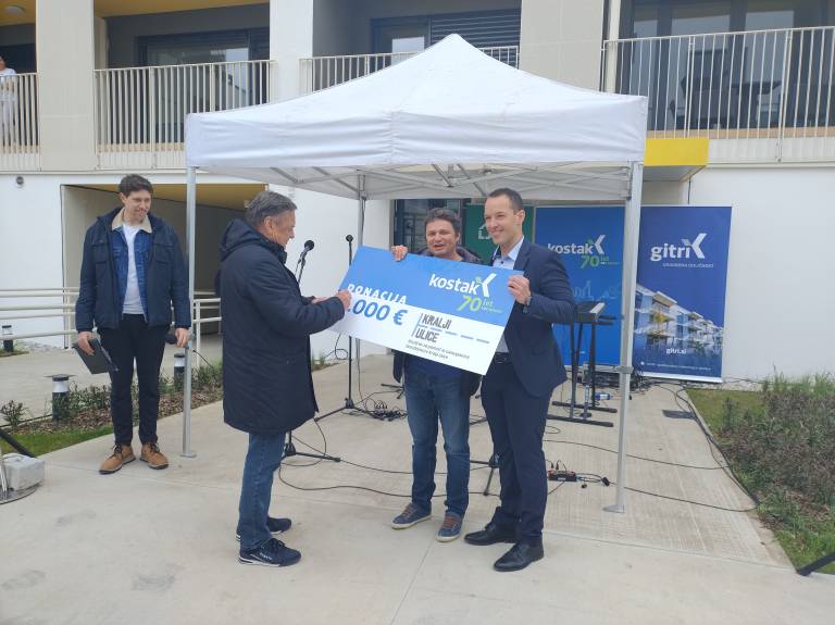 Stanovanja je zgradilo podjetje Gitri, ki je del skupine krškega gradbinca Kostak. Ta je ob koncu današnje slovesnosti Društvu za pomoč in samopomoč brezdomcev Kralji ulice podelil donacijo pet tisoč evrov, a je k kralju ulice, ki je donacijo prevzemal, pristopil župan Janković in z debelim flomastrom številko 5 spremenil v 10, tako da je donacija na koncu znašala 10 tisoč evrov.