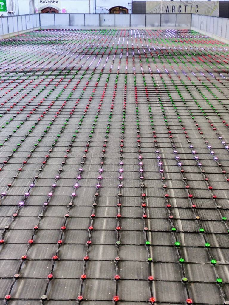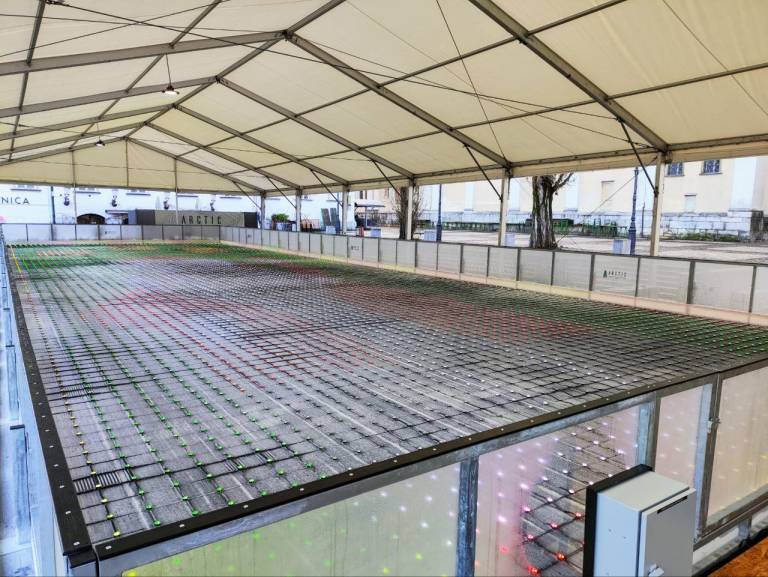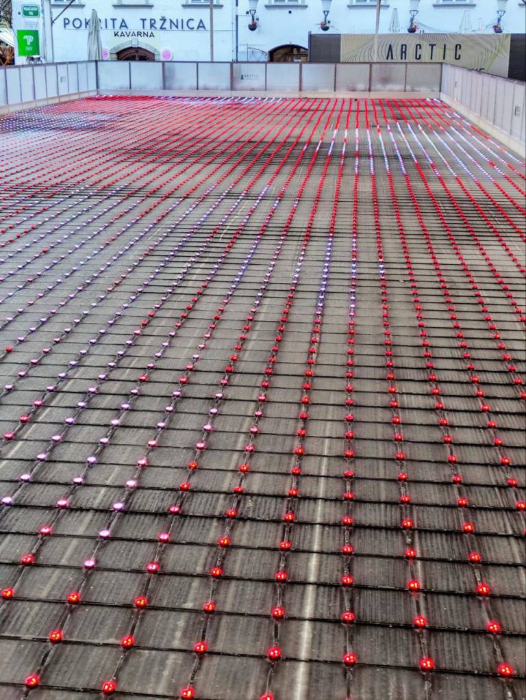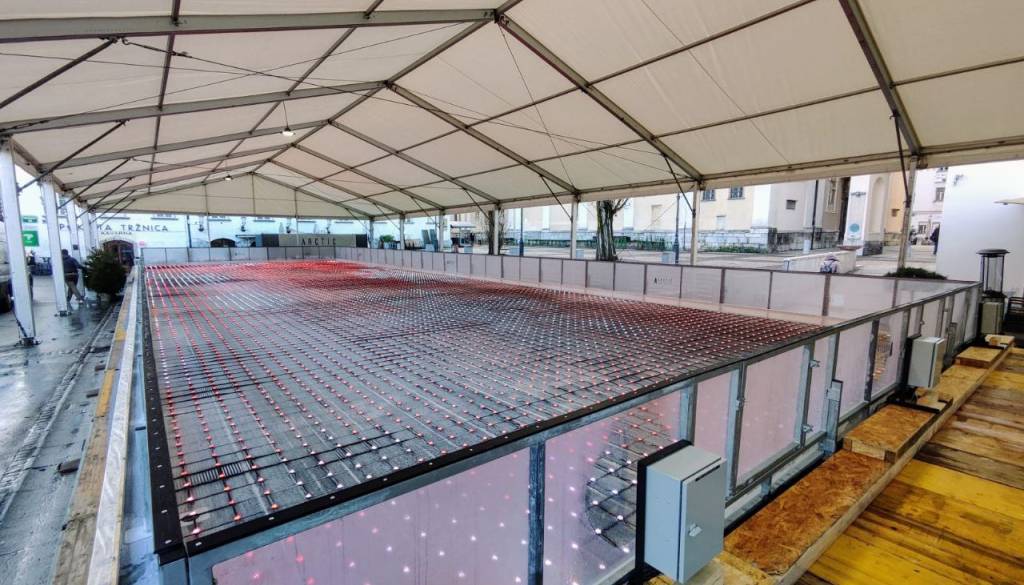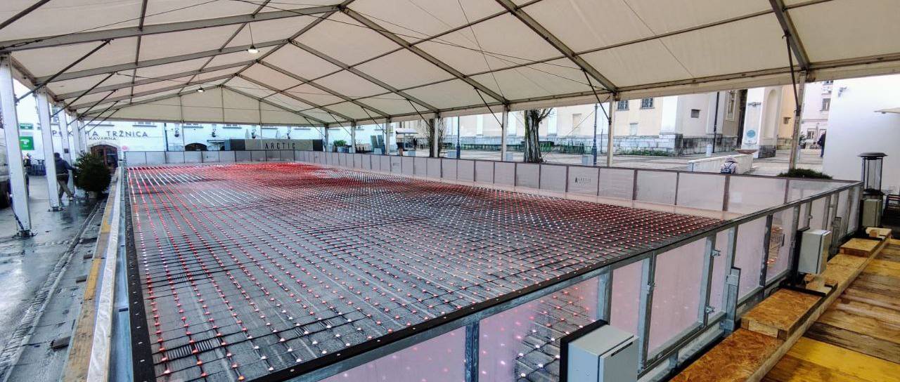 Še posebej nas je očarala letošnja novost, saj smo delavce ujeli ravno med nameščanjem talnih lučk. Drsališče ima tudi streho.
