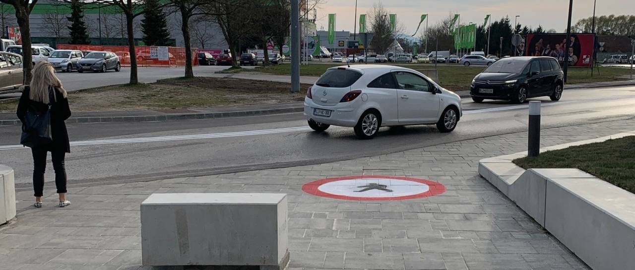 Ob prenovljenem trgovskem središču v Ljubljani so se pojavile nenavadne talne oznake.