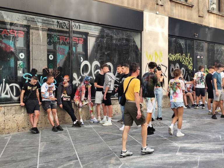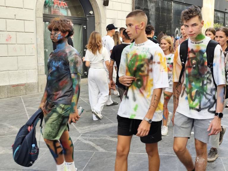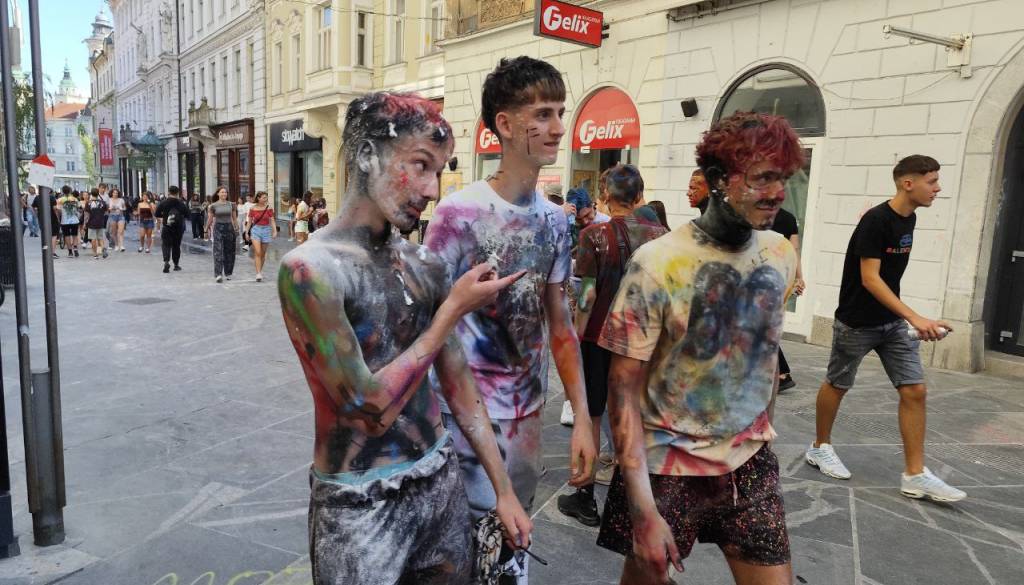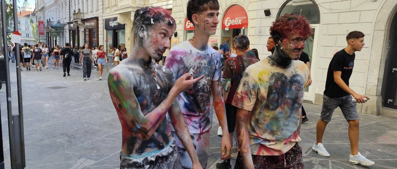 Dijaki imajo obraz, roke in oblačila popisana s pisanimi flomastri, med množico pa odmevajo tudi poki balonov, ki so napolnjeni z belim prahom.