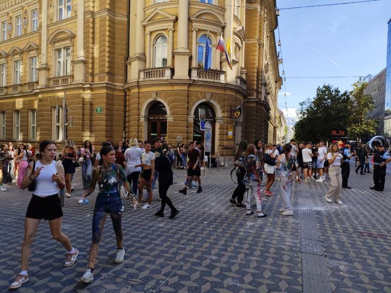 Po Čopovi in Slovenski ulici se vrstijo dijaki, ki na svoj način obeležujejo prvi šolski dan.