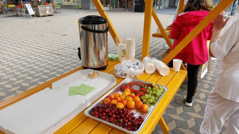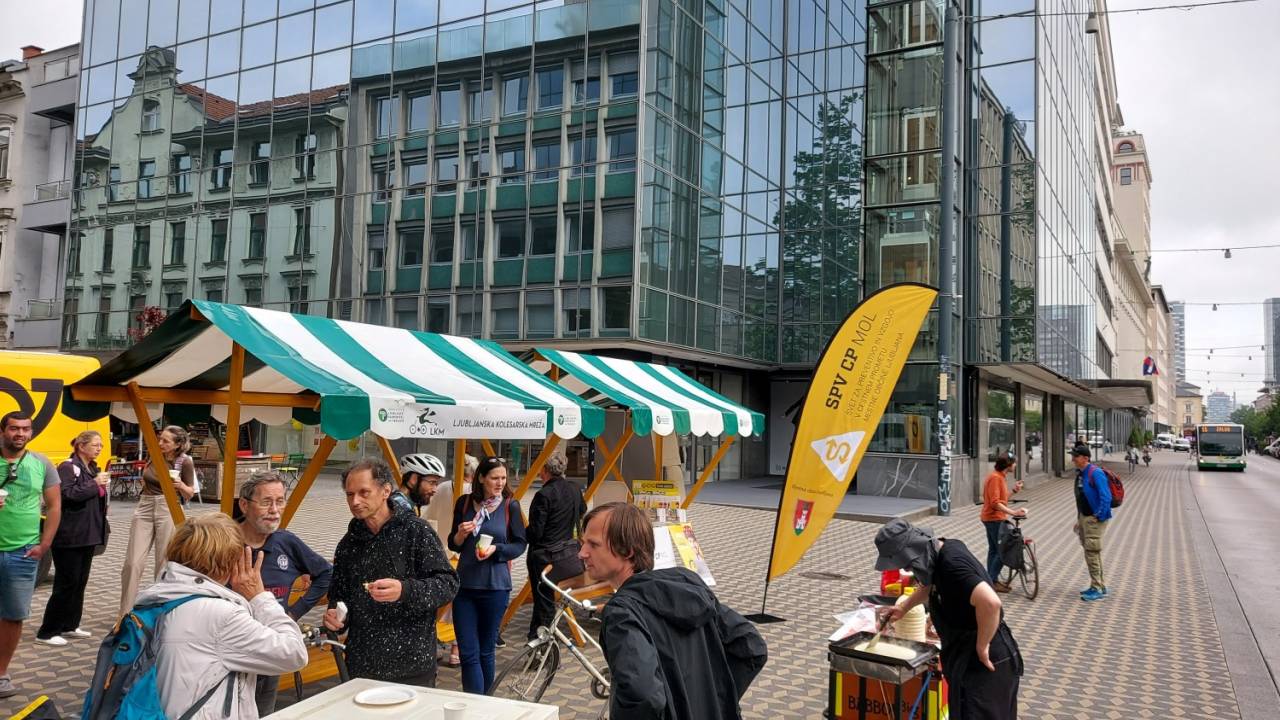 Številni kolesarji so se danes ustavili ob stojnicah na Slovenski cesti ob Konzorciju, kjer so se lahko okrepčali s sadjem in kavo. Za bolj sladkosnede so bile na voljo tudi palačinke in rogljički. Kolesarski zajtrk je v sodelovanju z Ljubljansko kolesarsko mrežo organizirala Mestna občina Ljubljana.