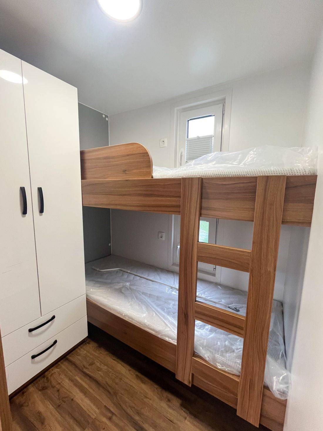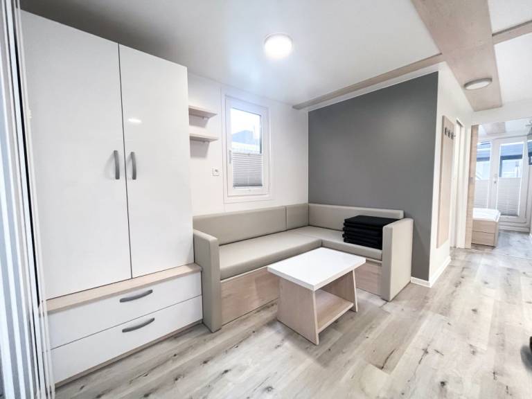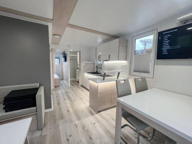 Opremljeni sta z vsemi sodobnimi udobji: dnevnim prostorom s sedežno garnituro (ki služi tudi kot dodatno ležišče), spalnico z zakonsko posteljo, otroško sobo s pogradom, popolnoma opremljeno kuhinjo in kopalnico s tuš kabino.