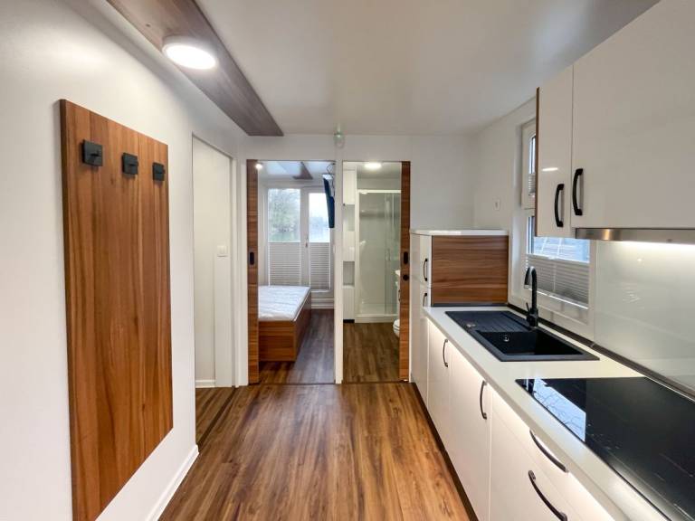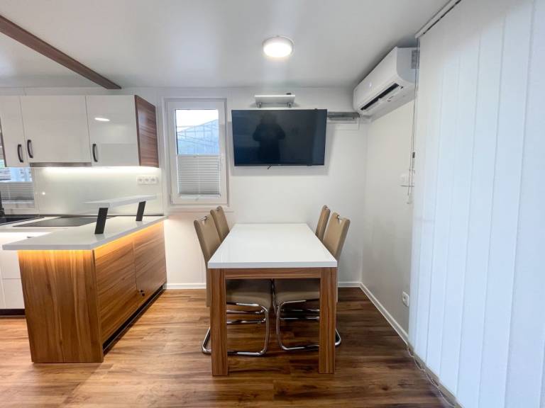 Hišici dolžine 11 in širine 4 metrov ponujata kar 70 kvadratnih metrov uporabne površine – 32 kvadratnih metrov notranjega prostora in 38 32 kvadratnih metrov prostorne strešne terase z masažnim bazenom.