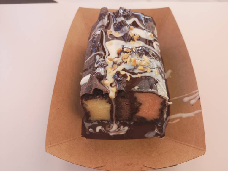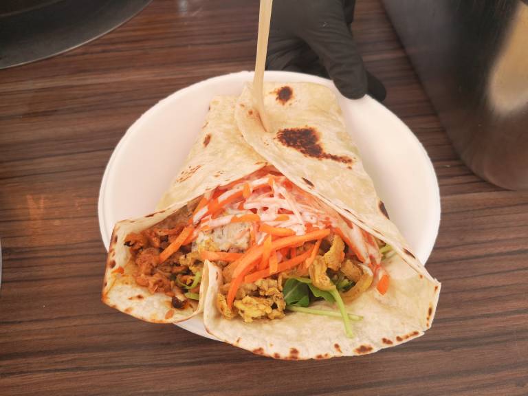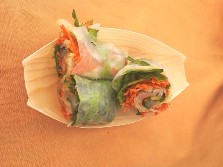 Med drugim ponujajo sveže vietnamske zavitke (na fotografiji spodaj), rdeči tajski curry, black tiger gambere na žaru, riževo skledo, teriyaki piščanca, in rostbif black angus govedo.