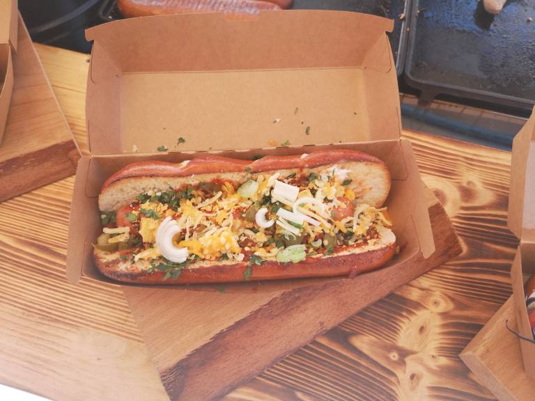 Food point na Odprti kuhni ponuja več različnih vrst hot-dogov: farmers dog, american dog, fresh dog, chilli beef dog (na fotografiji spodaj) in classic dog.