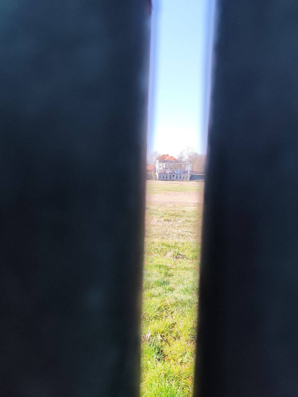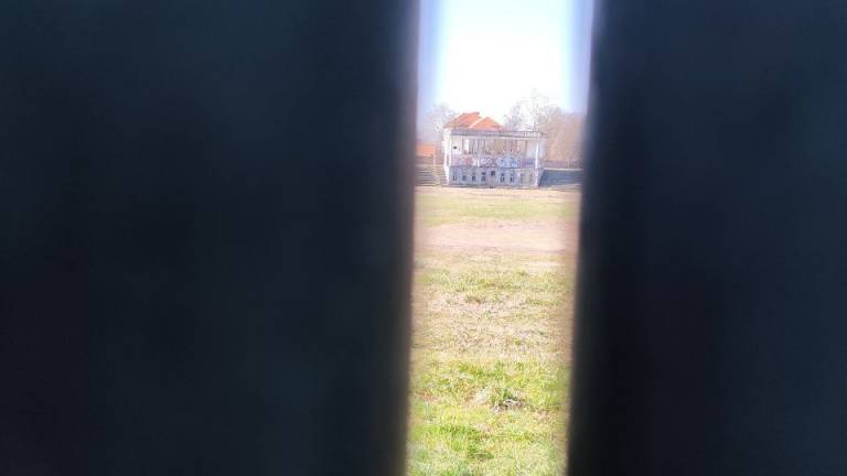 Notranjost, kolikor lahko vidimo skozi ograjo, je nevzdrževana in zarasla, kosi stadiona ležijo naokrog.