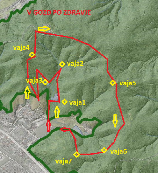 Na krožni tematski poti V gozd po zdravje je sedem označenih lokacij, kjer so na tablicah predstavljene vaje za boljše počutje in zdravje obiskovalcev. Vaje so različne: od fizične sprostitve do izboljšanja čustvenega stanja in razpoloženja, tkanja globlje povezanosti z naravo in samorefleksije.