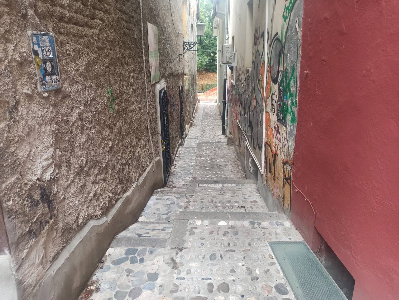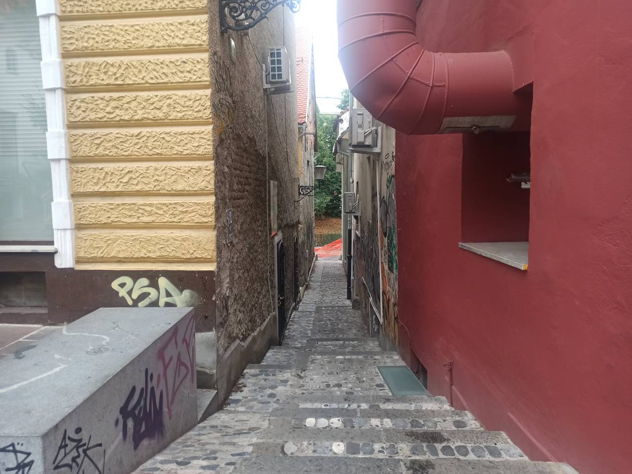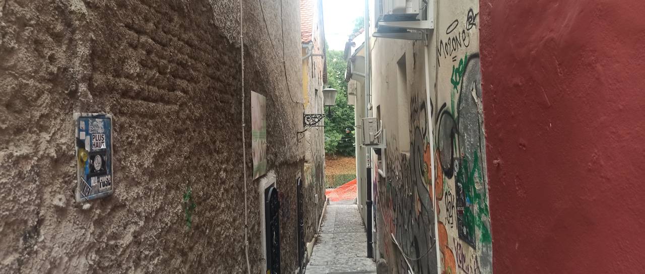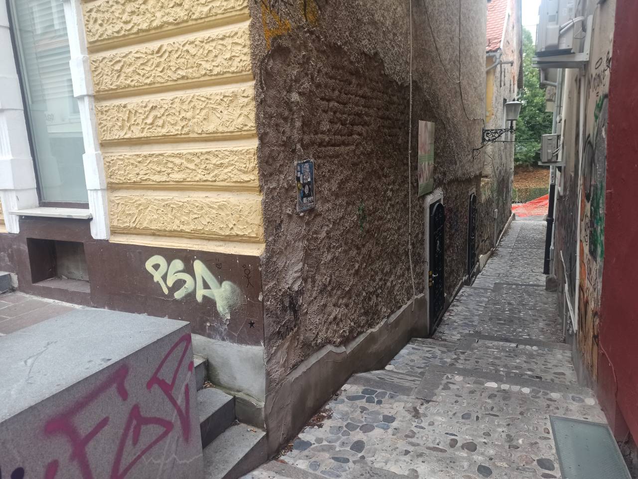 Na ulici lahko še vedno najdemo star način tlakovanja z rečnimi prodniki.