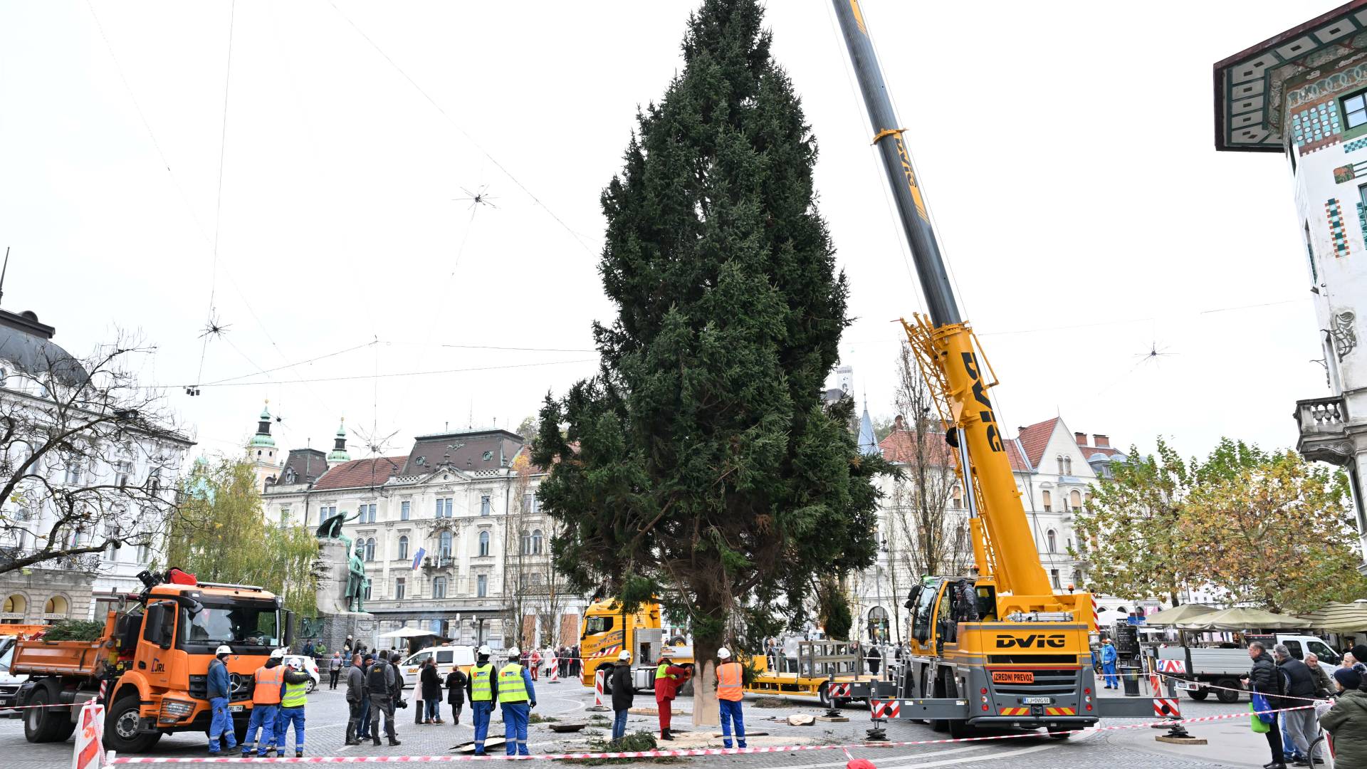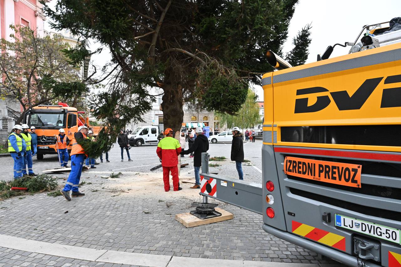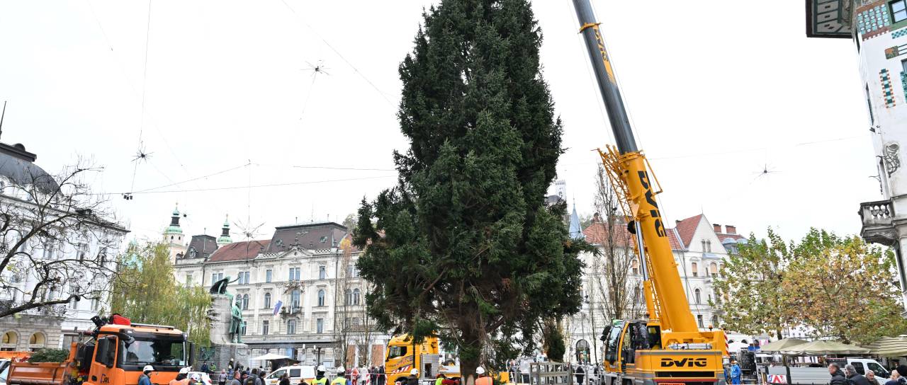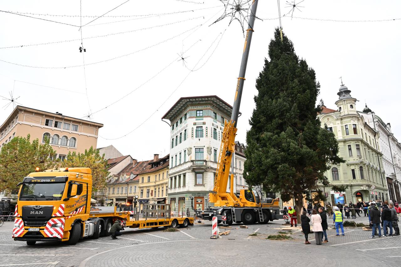 Ljubljana je danes doživela enega najlepših trenutkov praznične priprave – postavitev 21 metrov visoke smreke, ki bo letos osrednji okras Prešernovega trga.