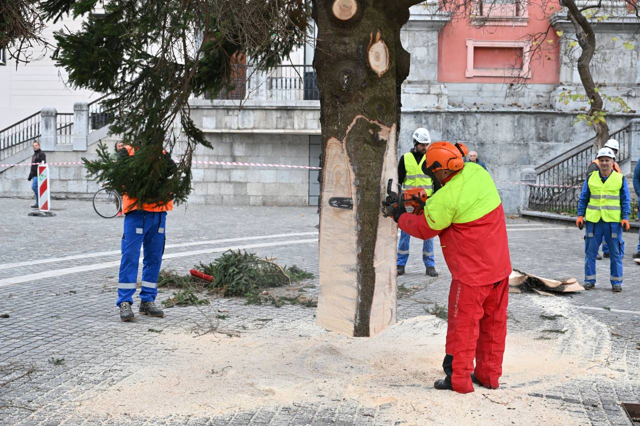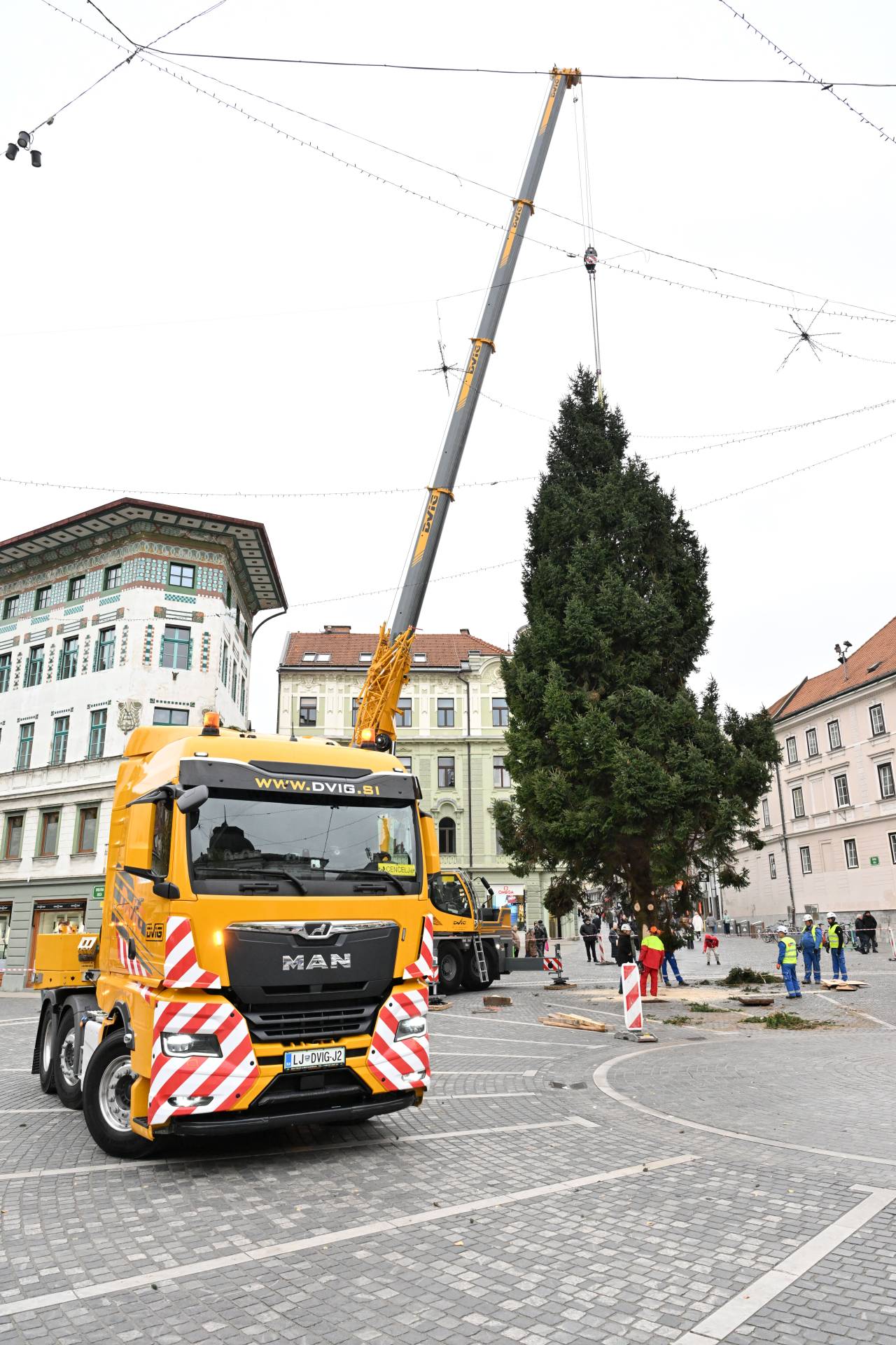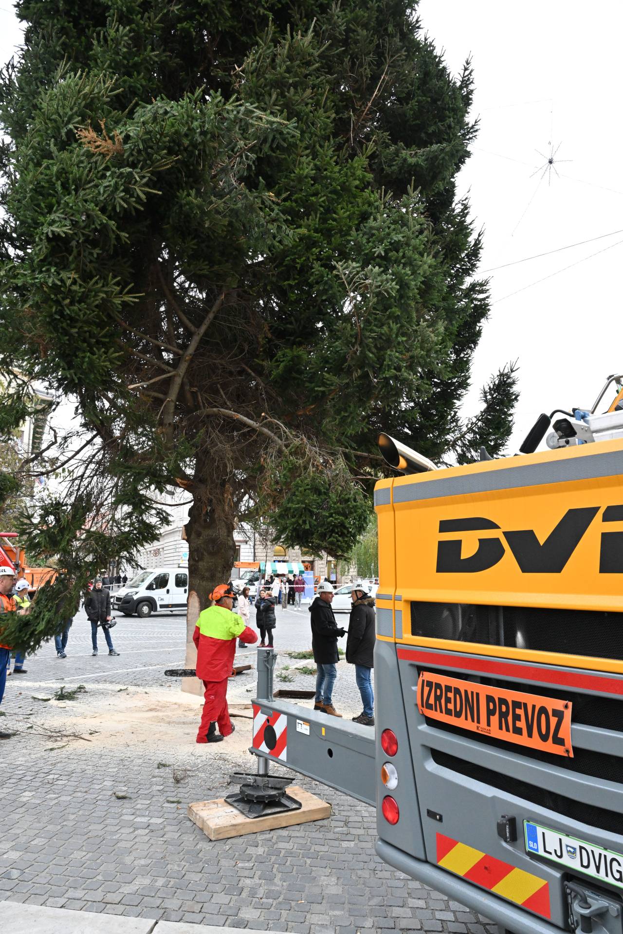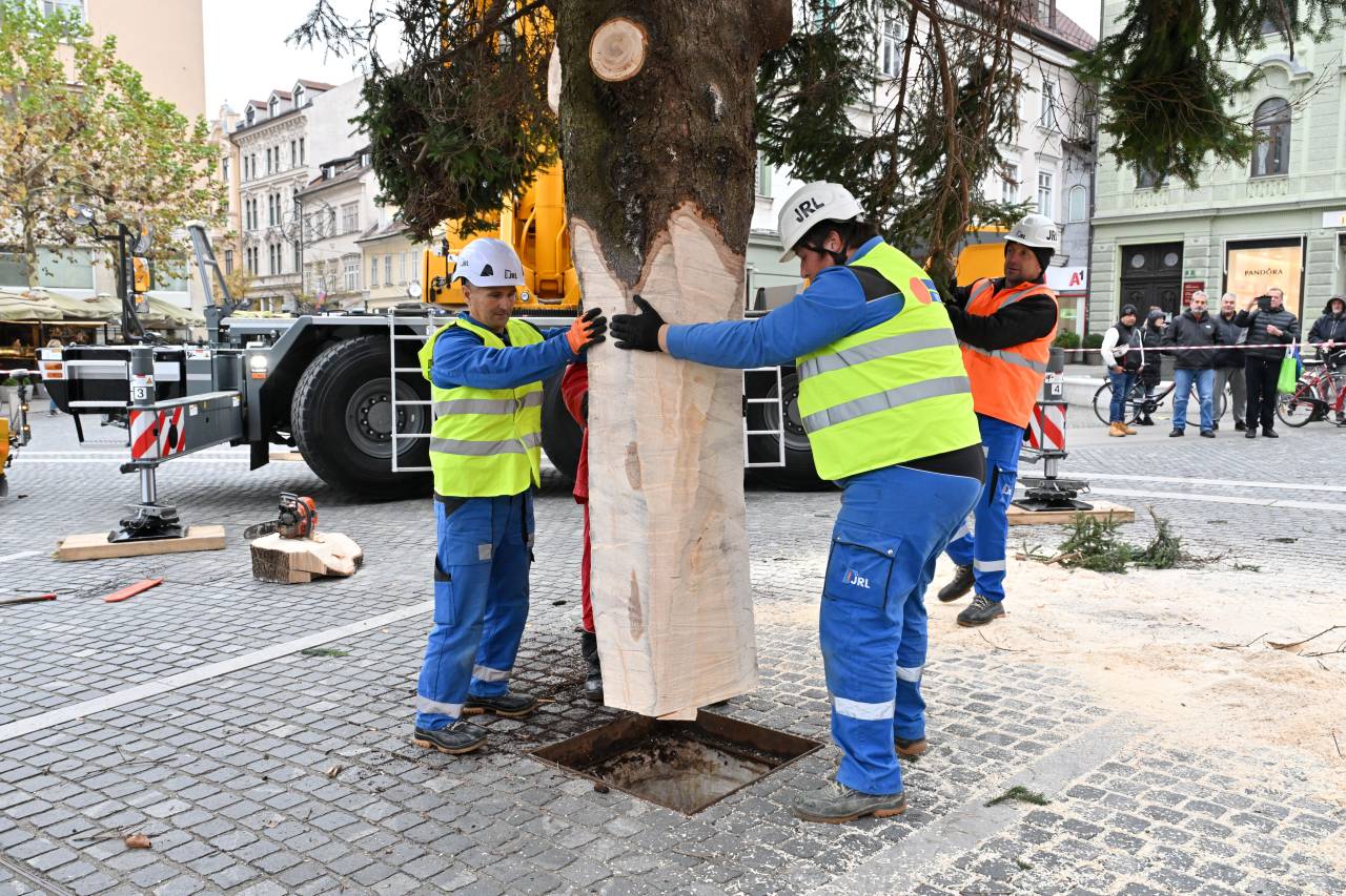 S posebnim transportom in ob sodelovanju strokovne ekipe so delavci drevo previdno postavili na mesto, kjer bo kraljevala čez celotno praznično sezono.