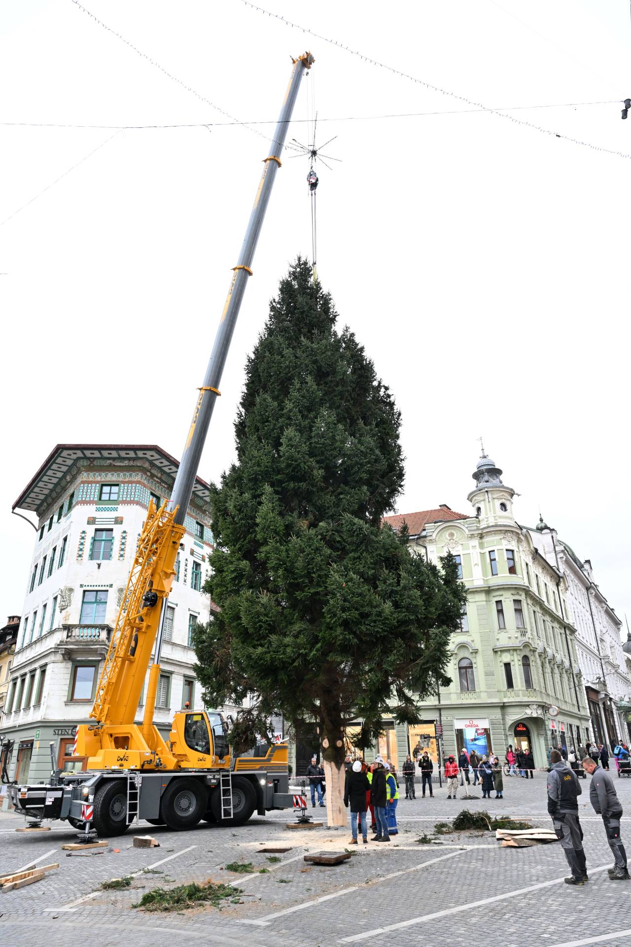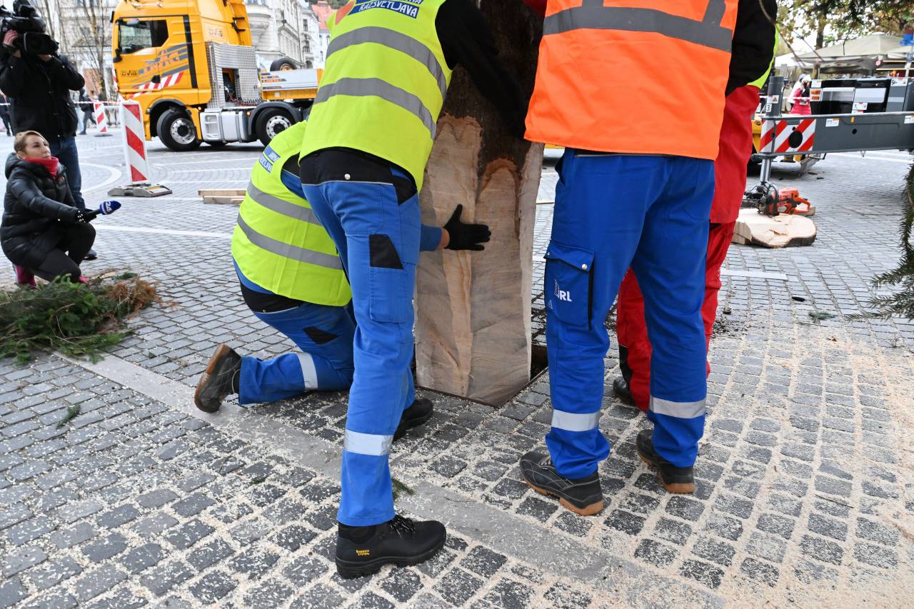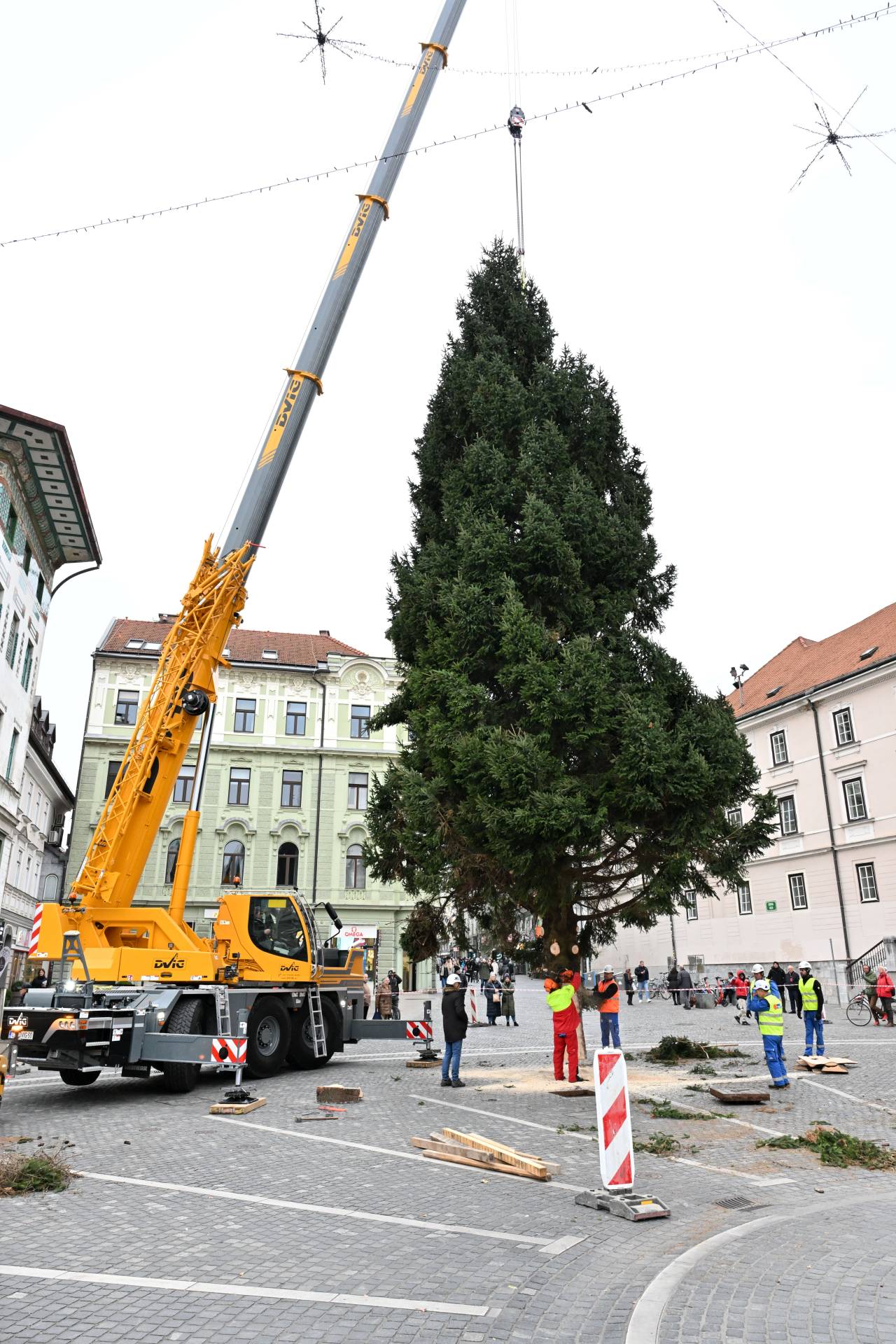 S posebnim transportom in ob sodelovanju strokovne ekipe so delavci drevo previdno postavili na mesto, kjer bo kraljevala čez celotno praznično sezono.