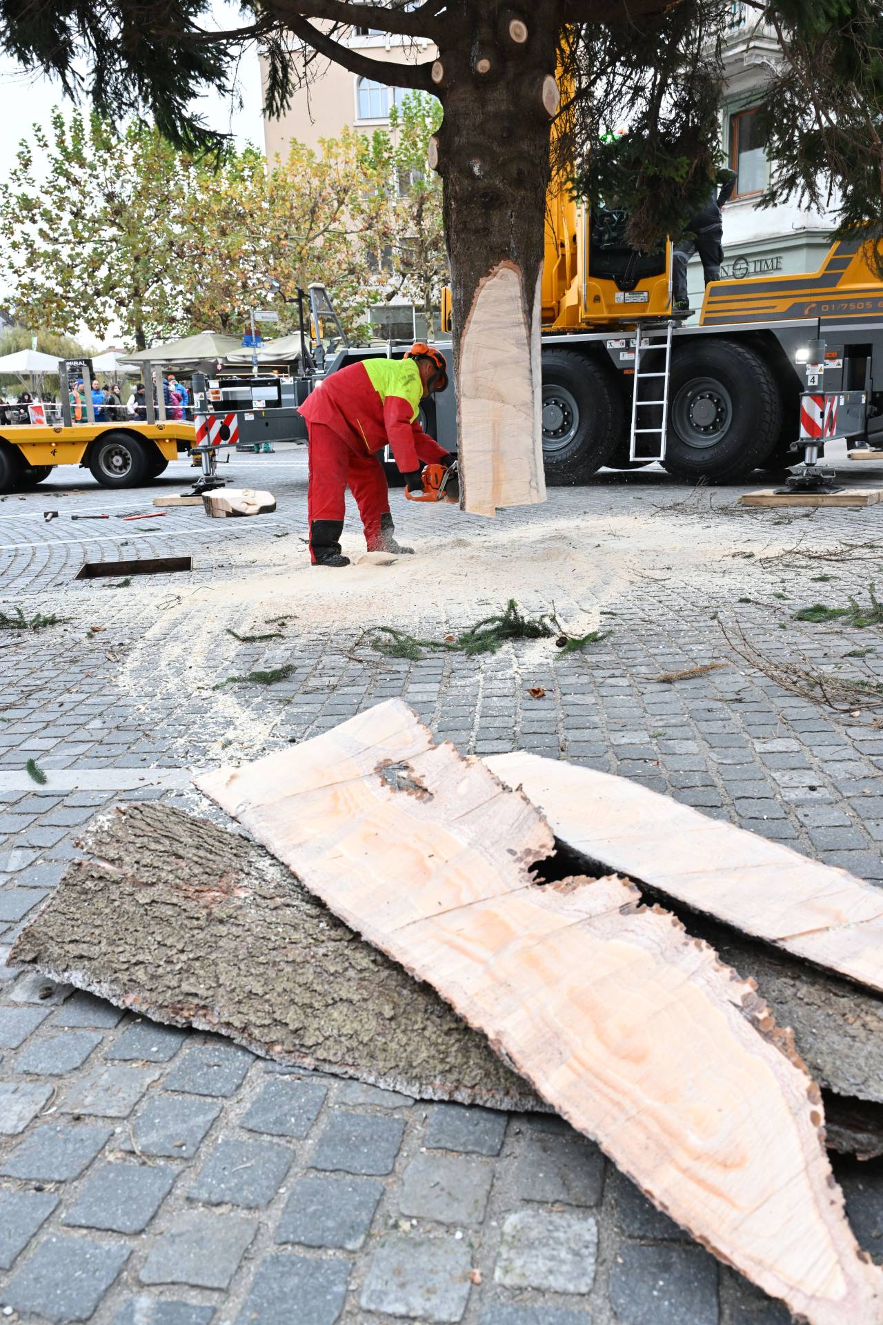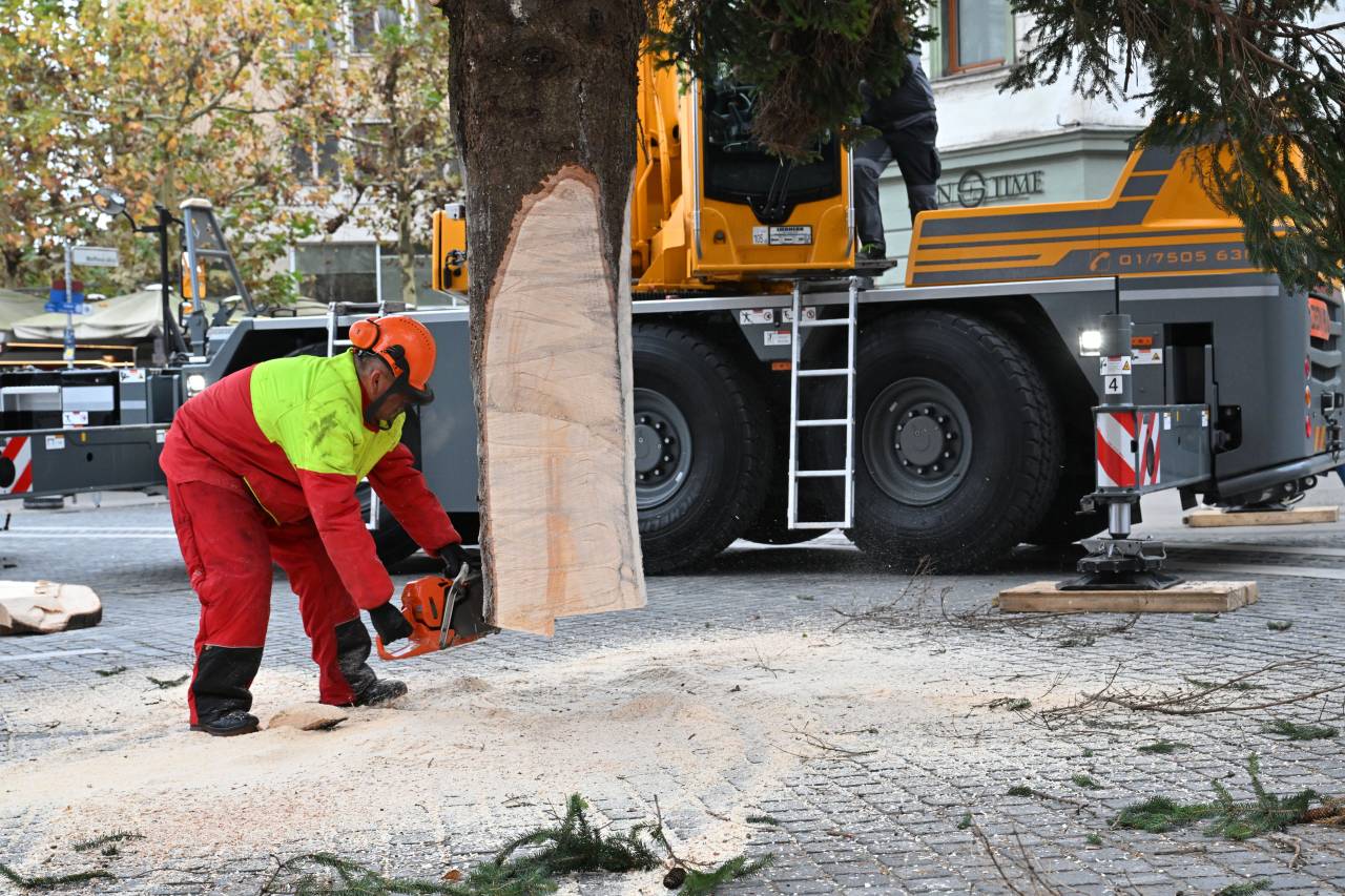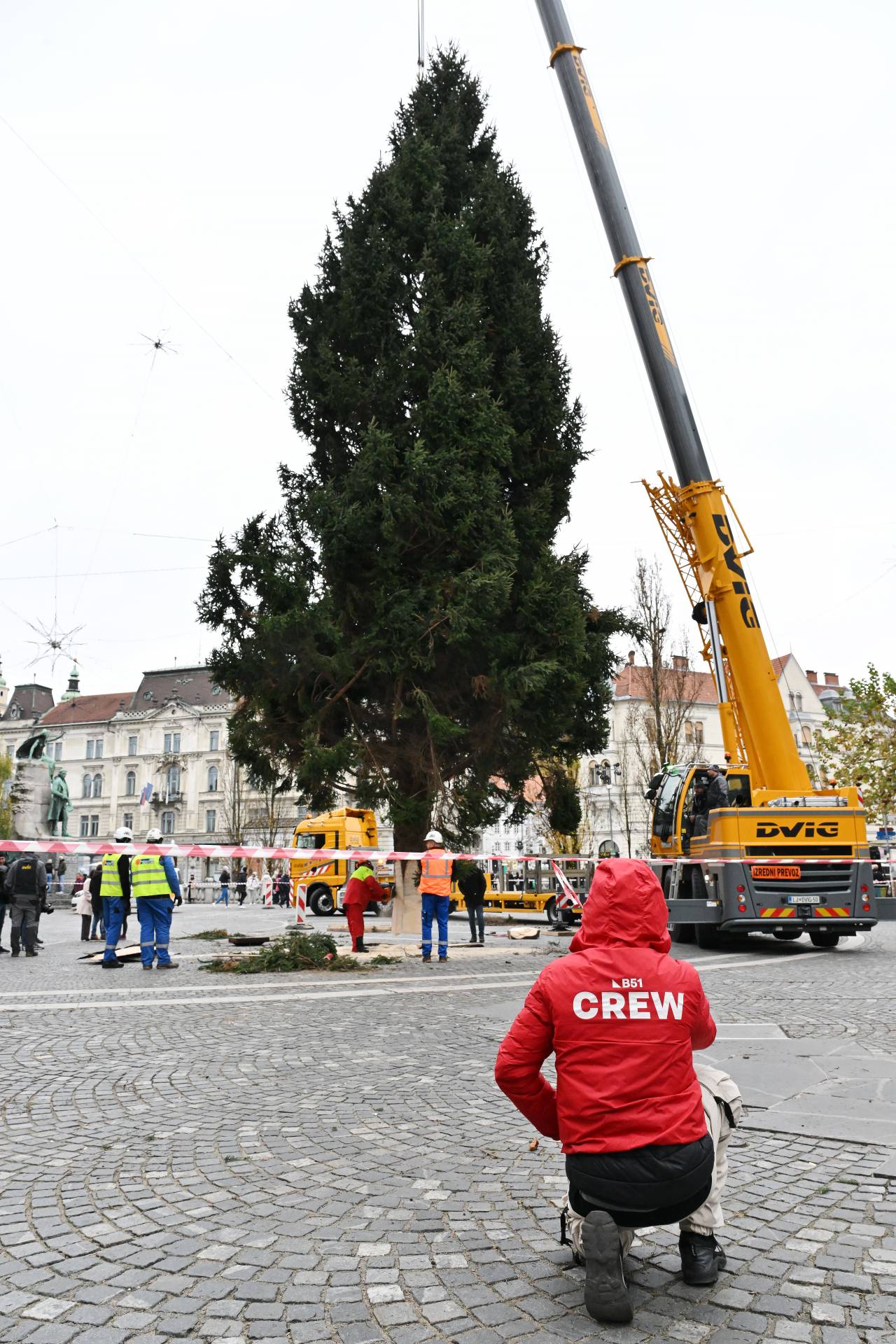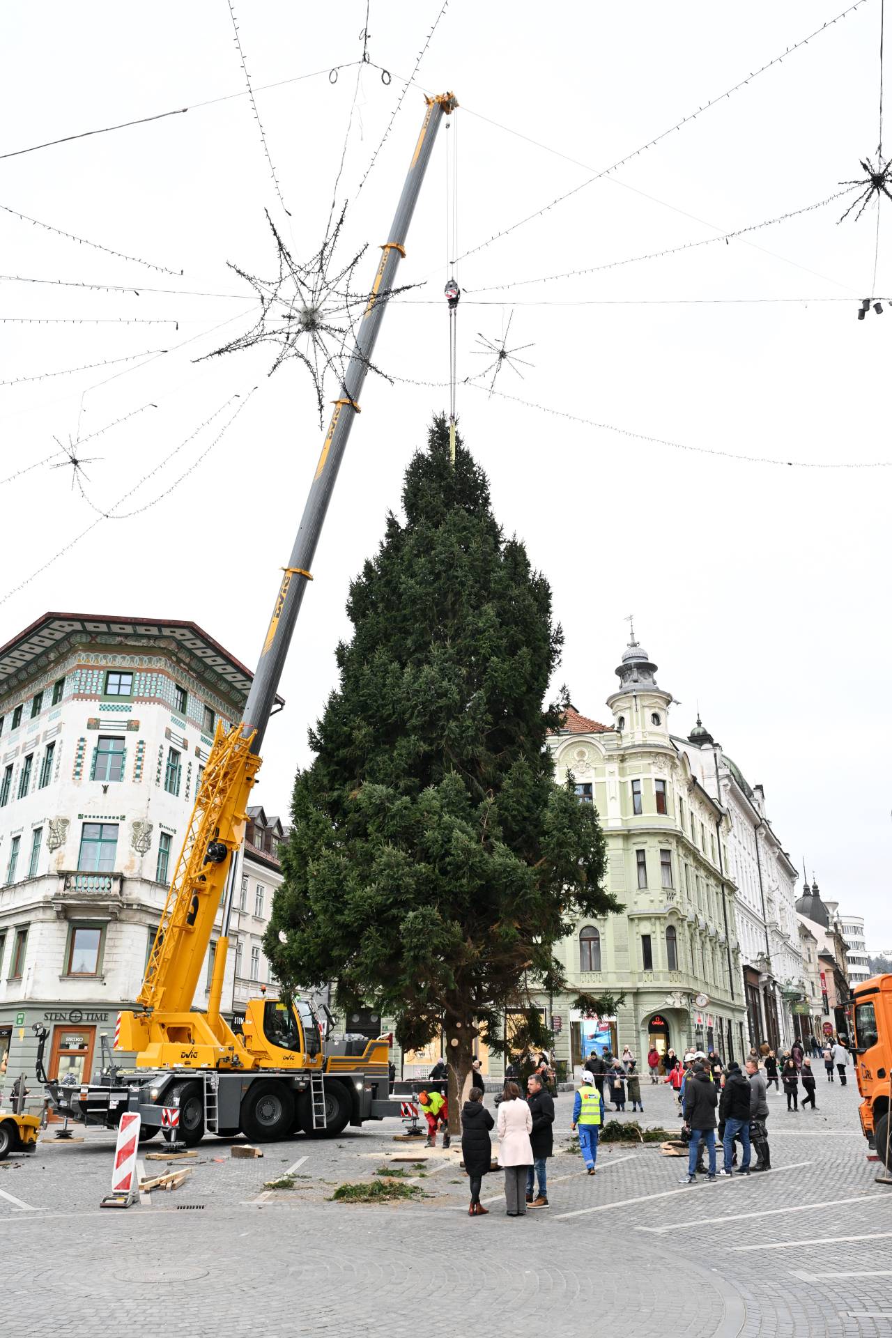 S posebnim transportom in ob sodelovanju strokovne ekipe so delavci drevo previdno postavili na mesto, kjer bo kraljevala čez celotno praznično sezono.