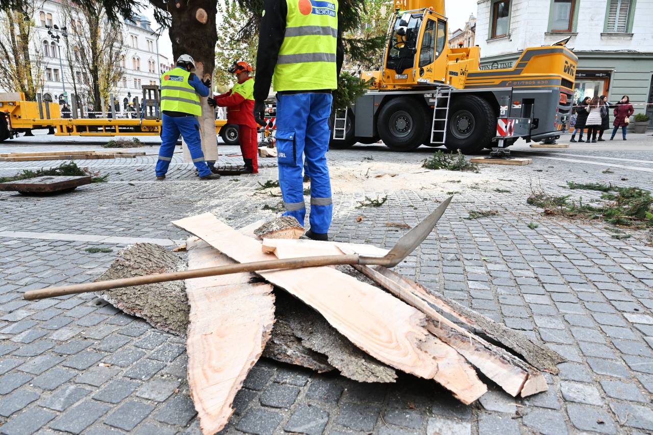 Tako so danes v Ljubljani postavljali kar 21 metrov visoko smreko.